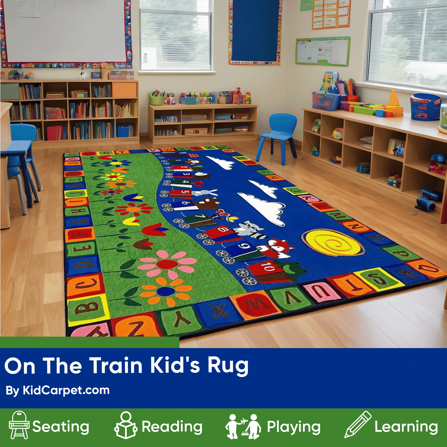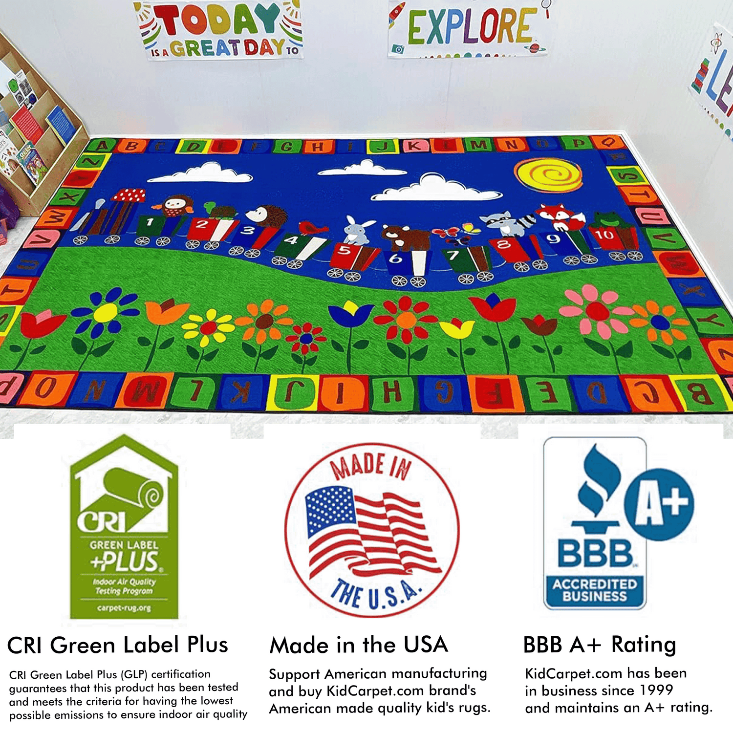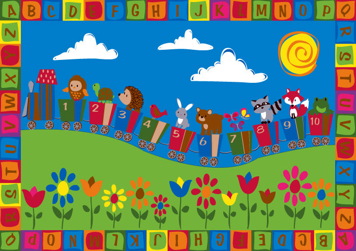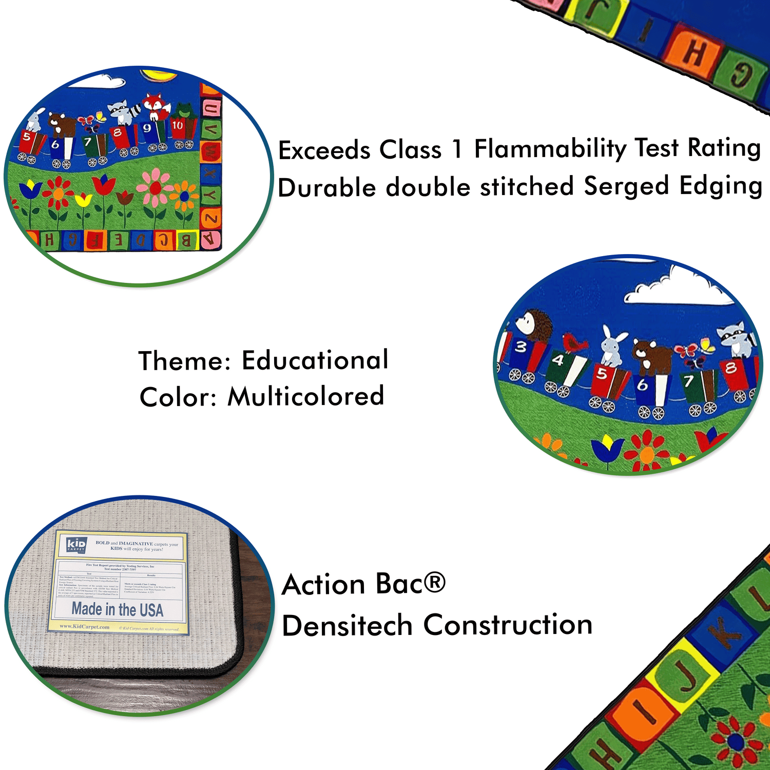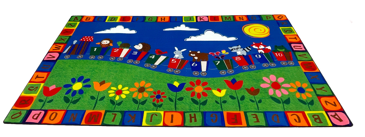 - All aboard the choo-choo train for an ABC 123 learning adventure on this bright and cheerful kid's rug