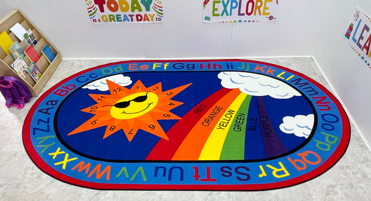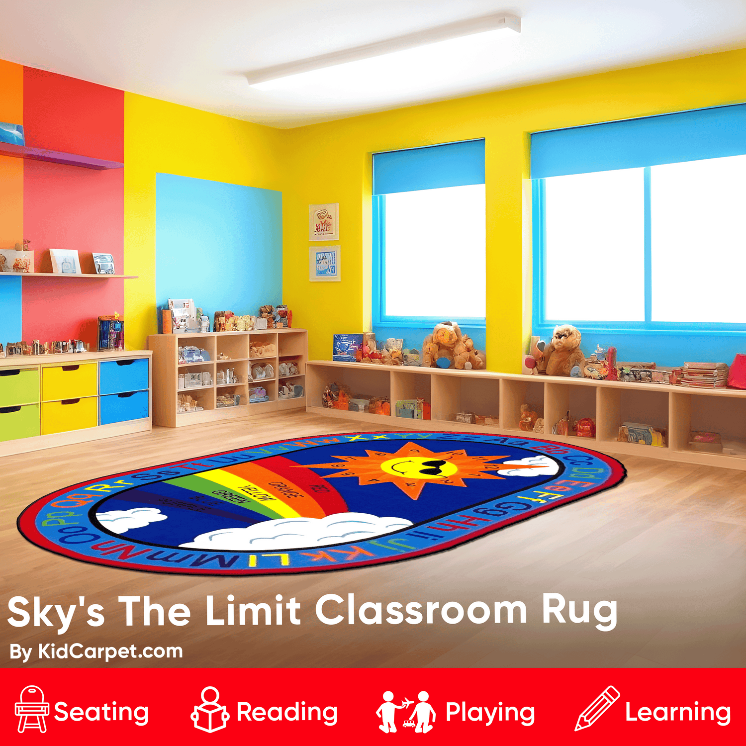 - Sky's the Limit Learning Rug features letters of the alphabet in upper and lower case, as well as colors of the rainbow and numbers representing a clock on the sun rays. It can be used in many lessons and is a perfect preschool rug.