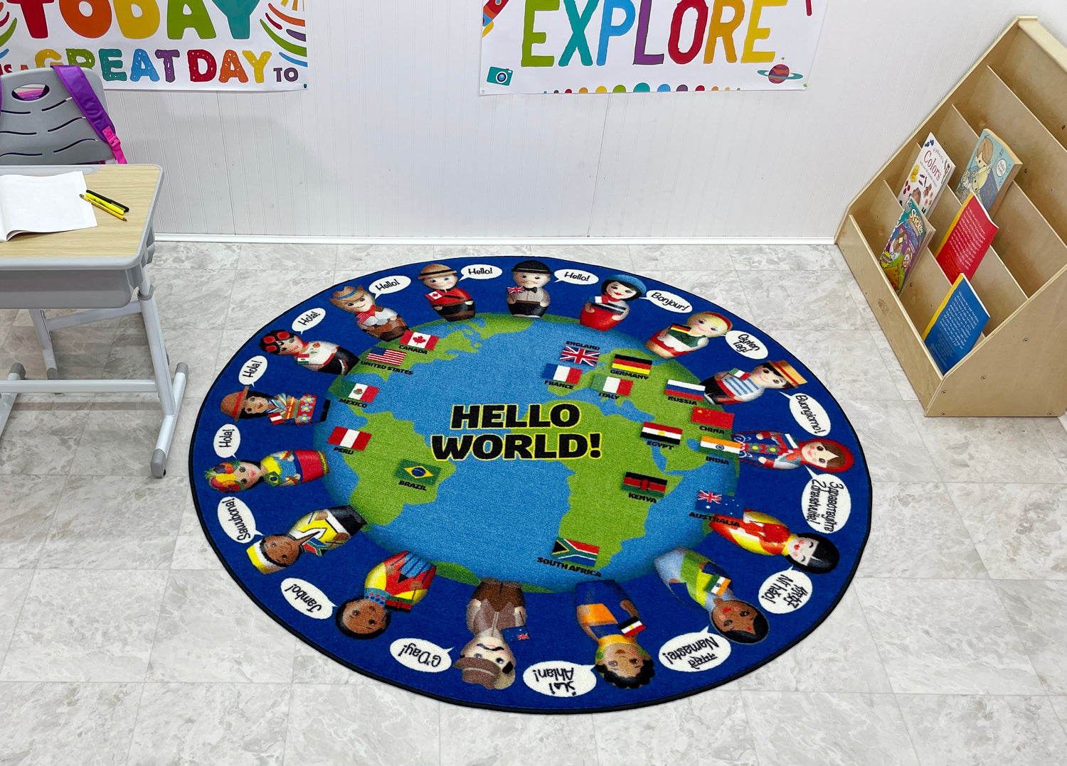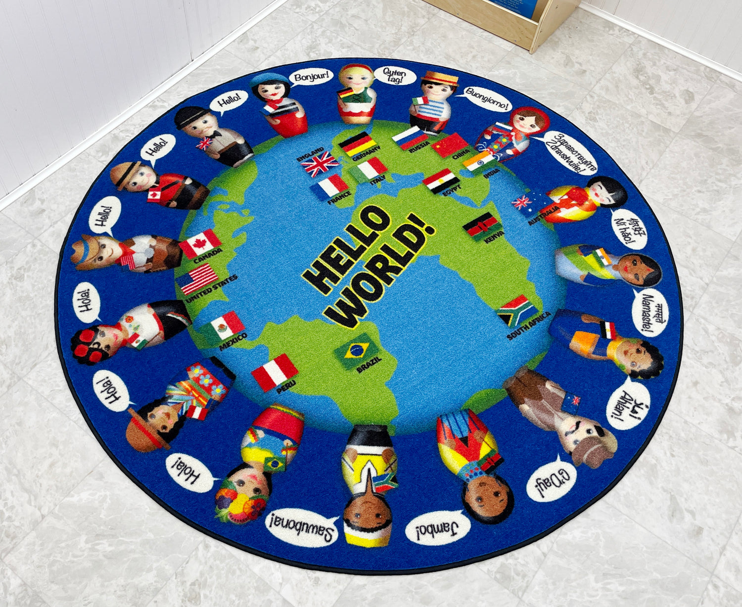 - Say "Hello" to everyone around the world with this bright and beautiful multicultural children's rug
