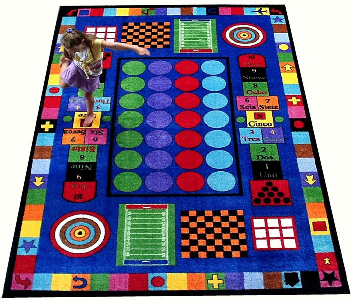 - This game board rug features a variety of game board patterns. Games are great for stimulating the mind and having fun, as well as entertaining when outdoors is not an option. Games on this play rug include: Twister, Checkers, Darts, Hopscotch, Tic-Tac-Toe, and (paper) Football.