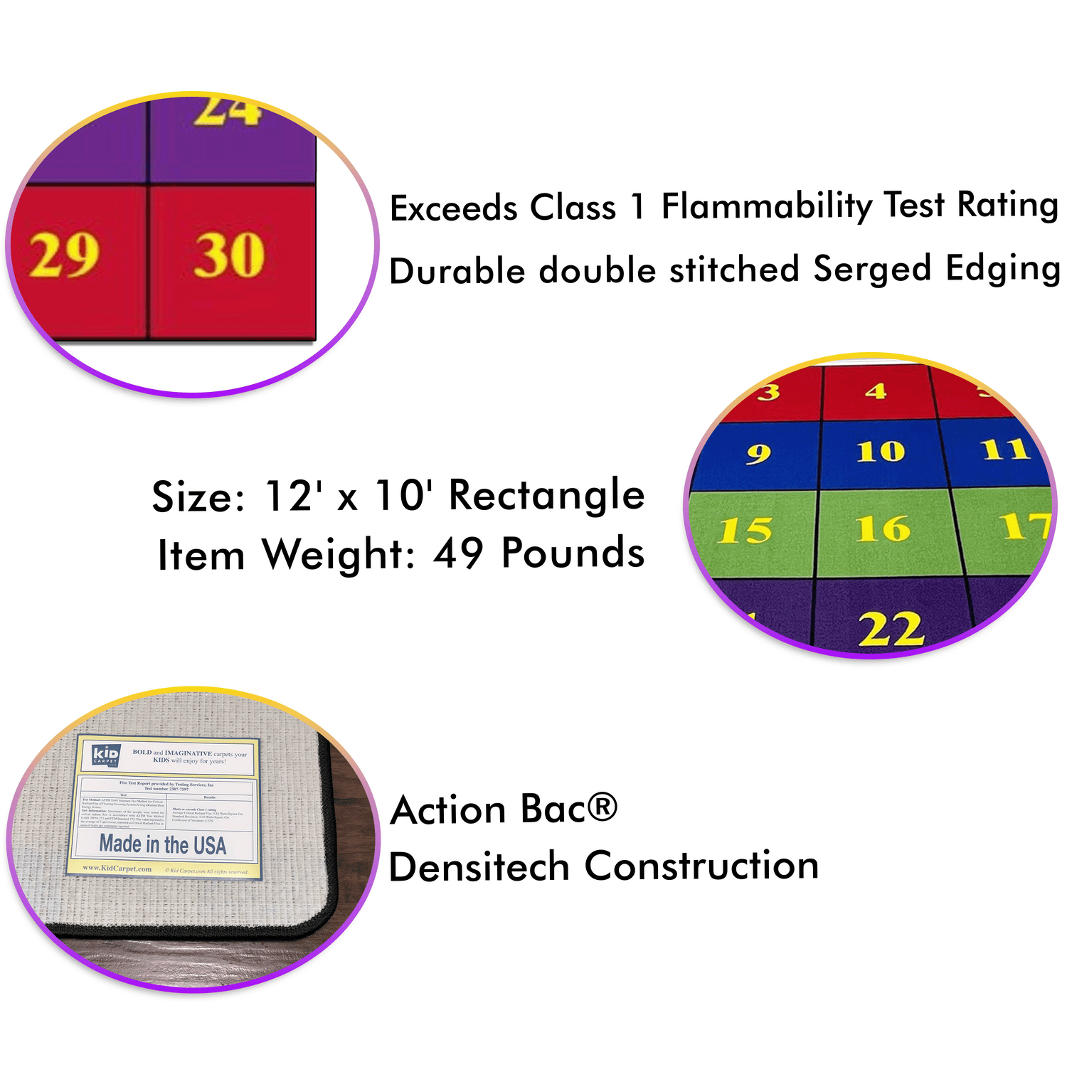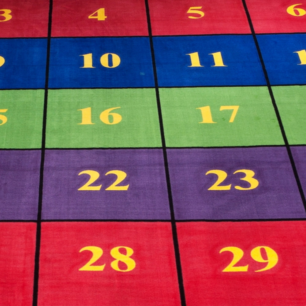 - Each numbered square is approximately 2' x 2', providing optimal room for kids to sit. Based on feedback from teachers, we use darker colors on our seating rugs because lighter colors, such as yellow, show dirt very easily.
