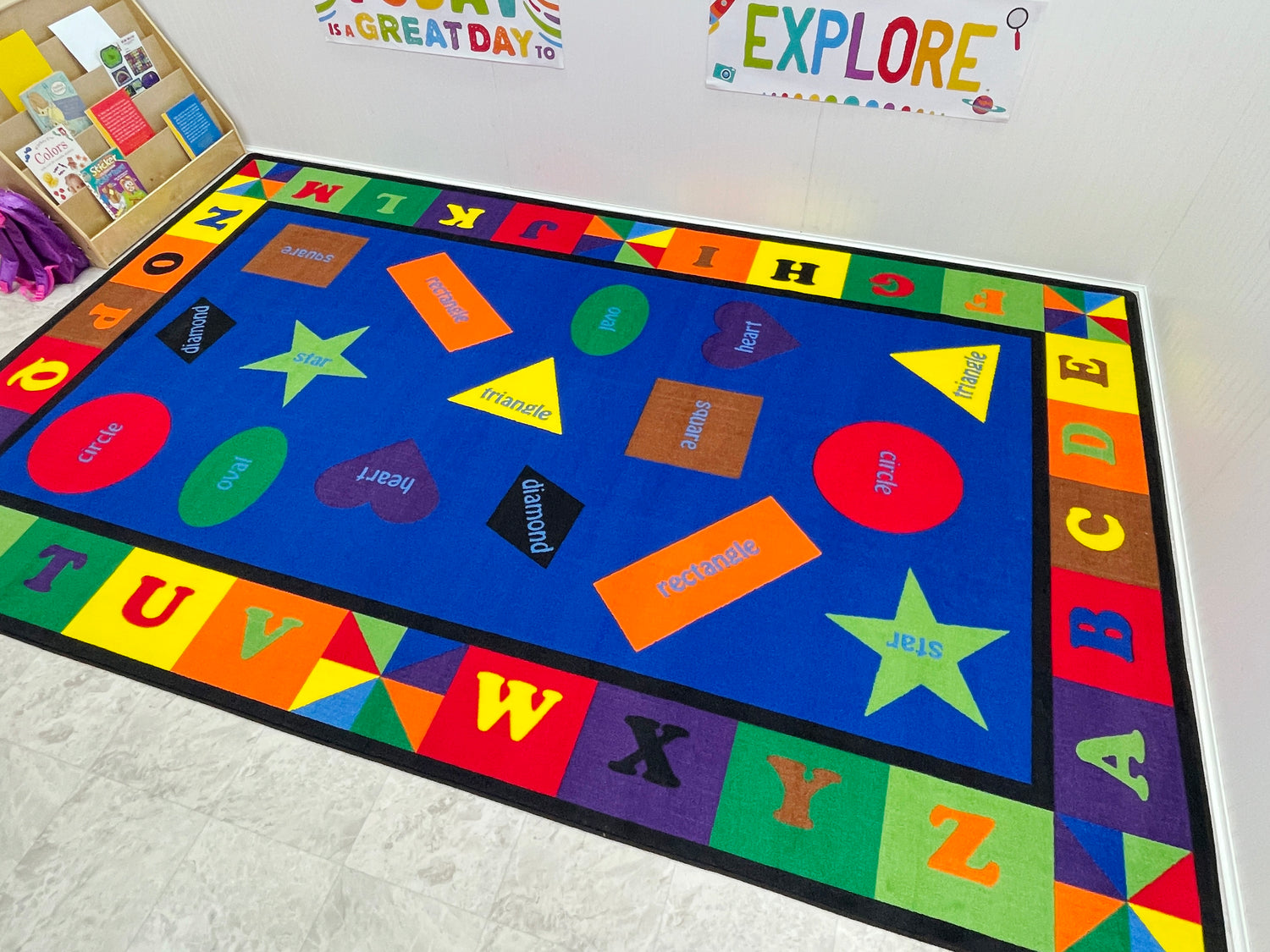 - The Bright Colorful Shapes preschool rug is perfect for teaching basic shapes and the alphabet