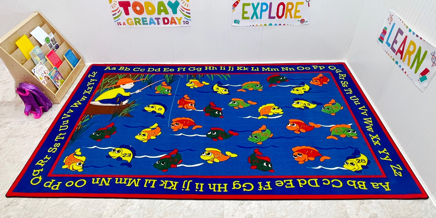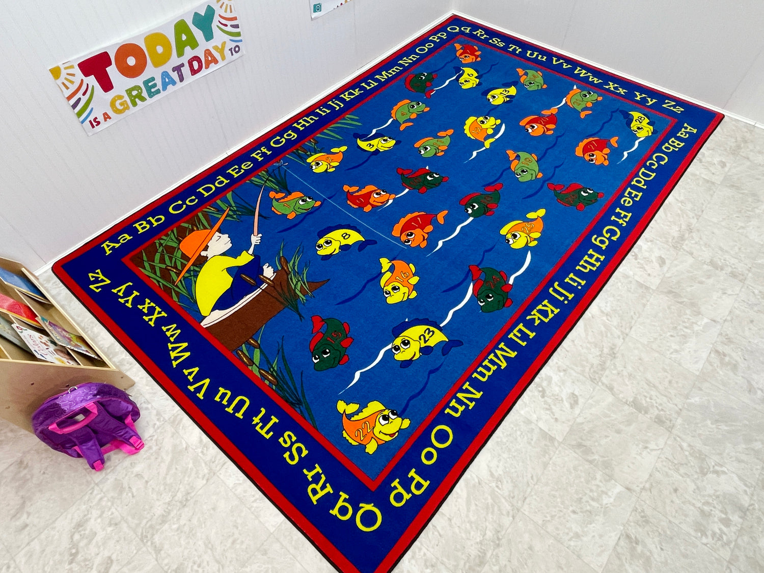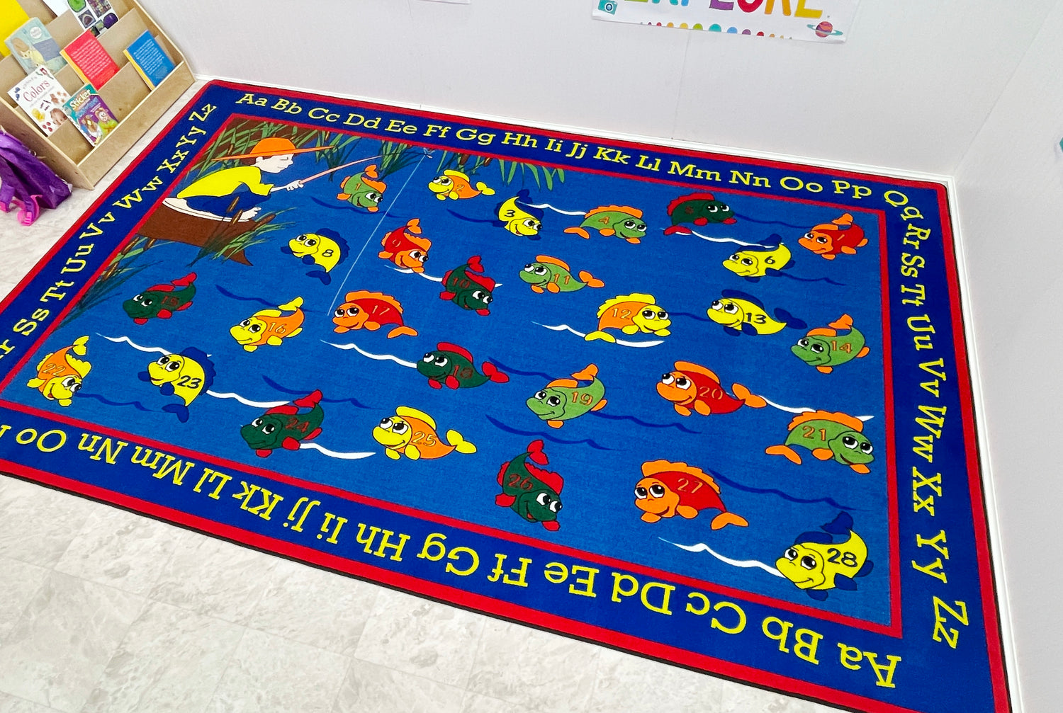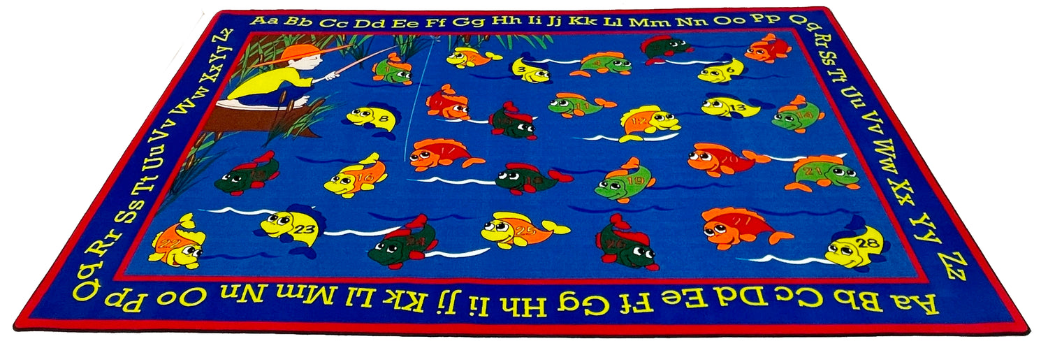 - The alphabet borders a cool stream with 28 happy fish swimming about on this school rug. Perfect for learning letters and numbers in the elementary classroom.
