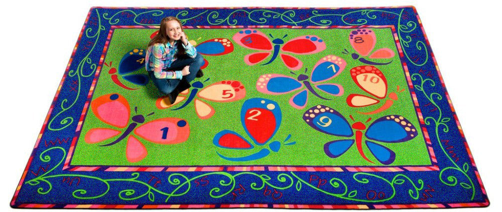 - These beautiful butterflies can brighten up any kid's space. With the alphabet in the border and dots on the butterflies to teach numbers, Learning on the Fly classroom rug is a fun classroom accessory.