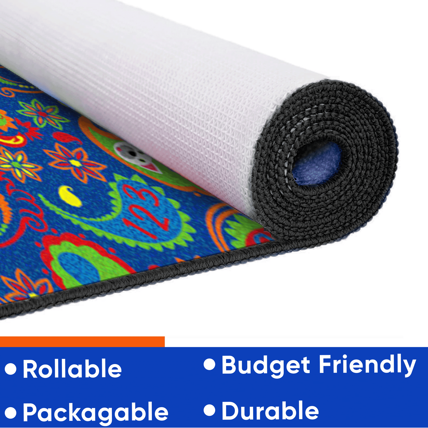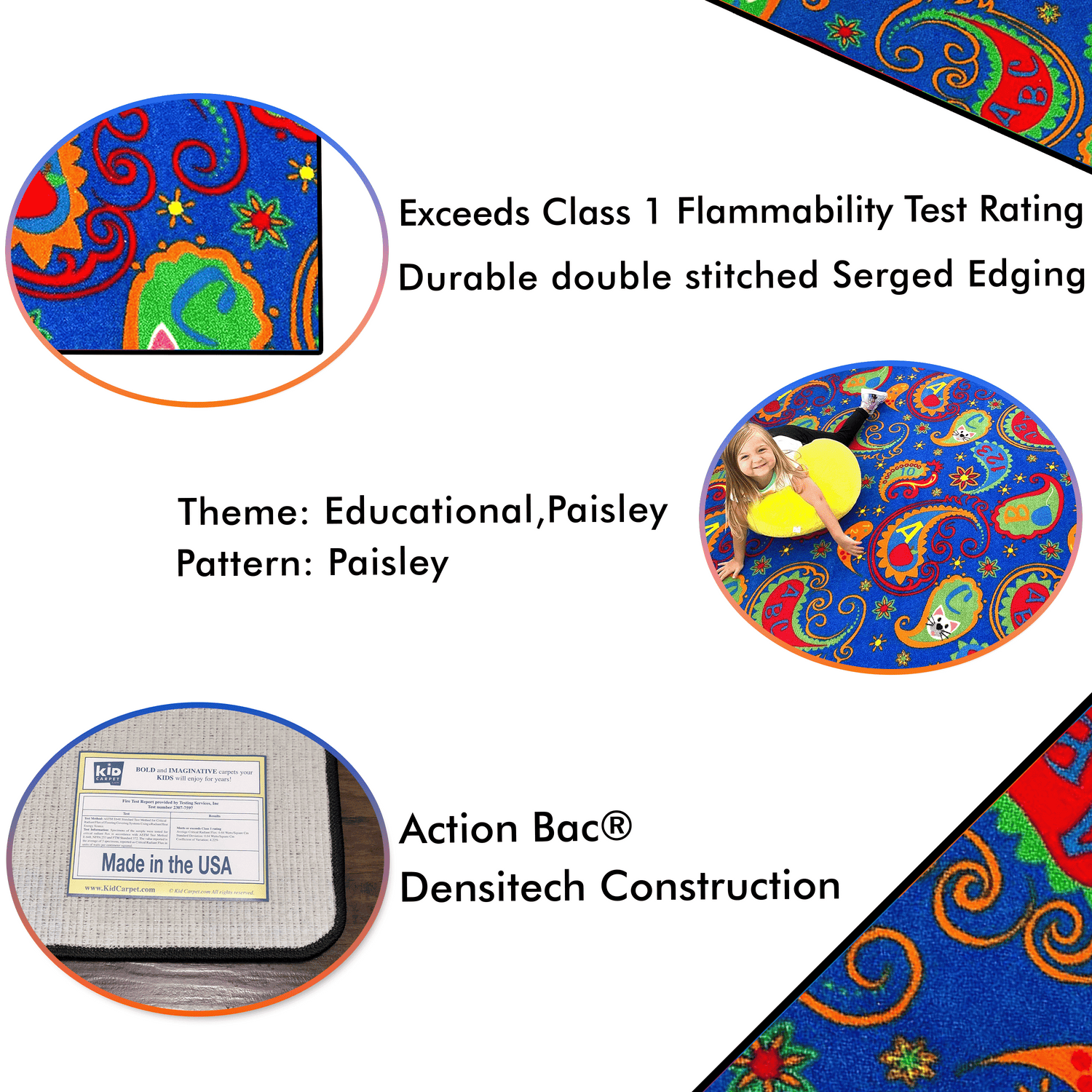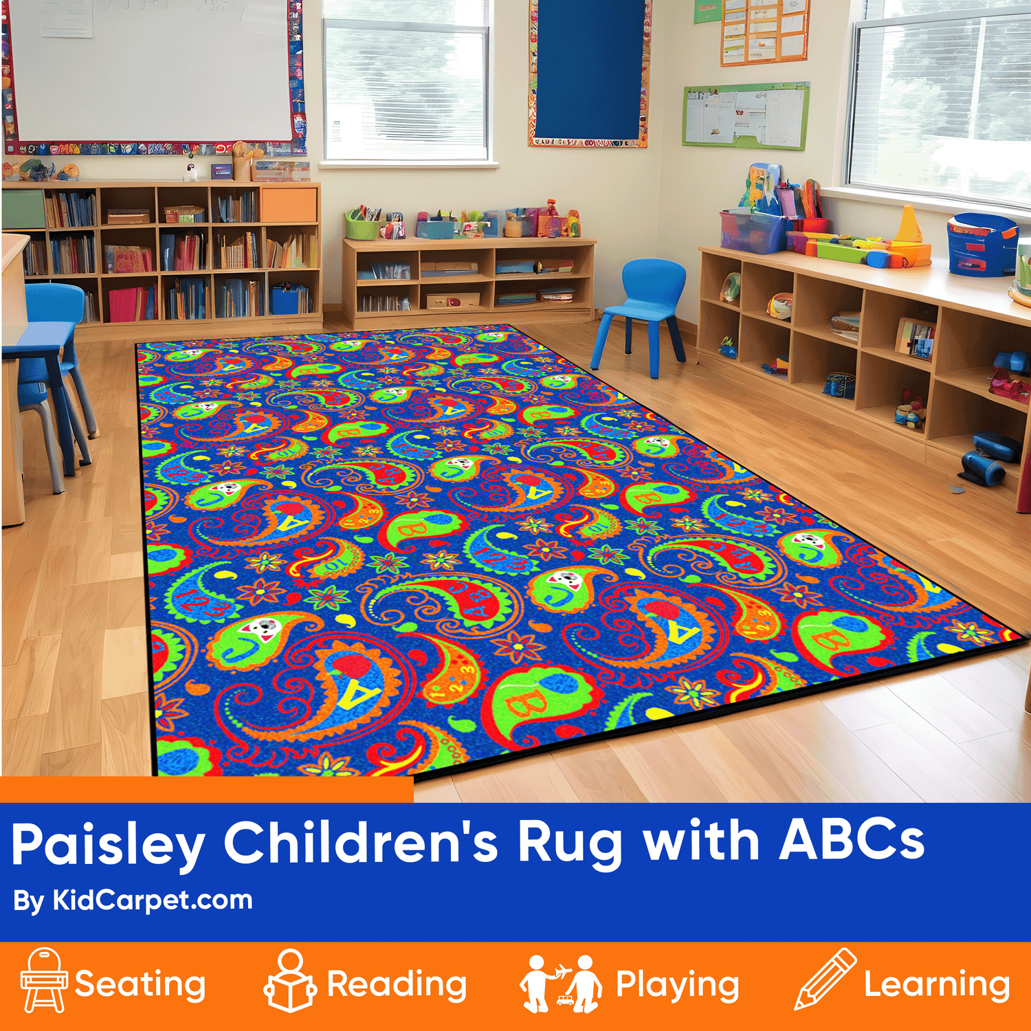 - With ABC's and 123's, this paisley print children's rug adds a fashionable touch to the room. Perfect for a daycare, a children's boutique, or anywhere a splash of style is in order