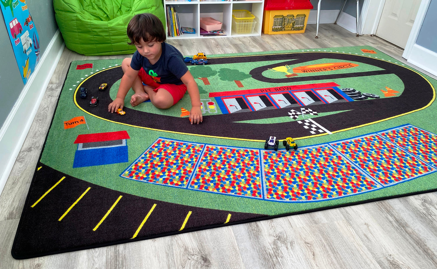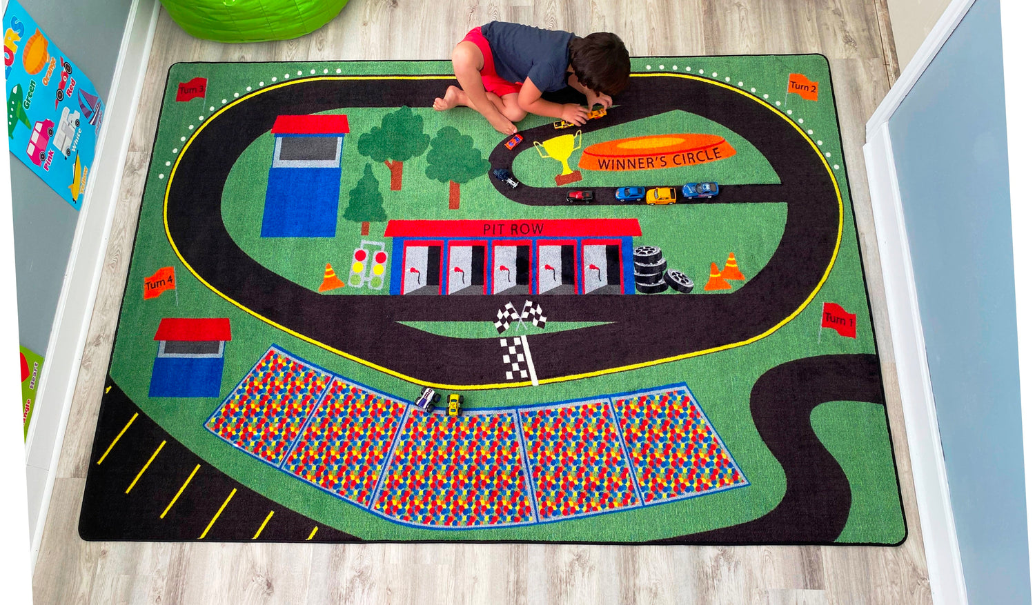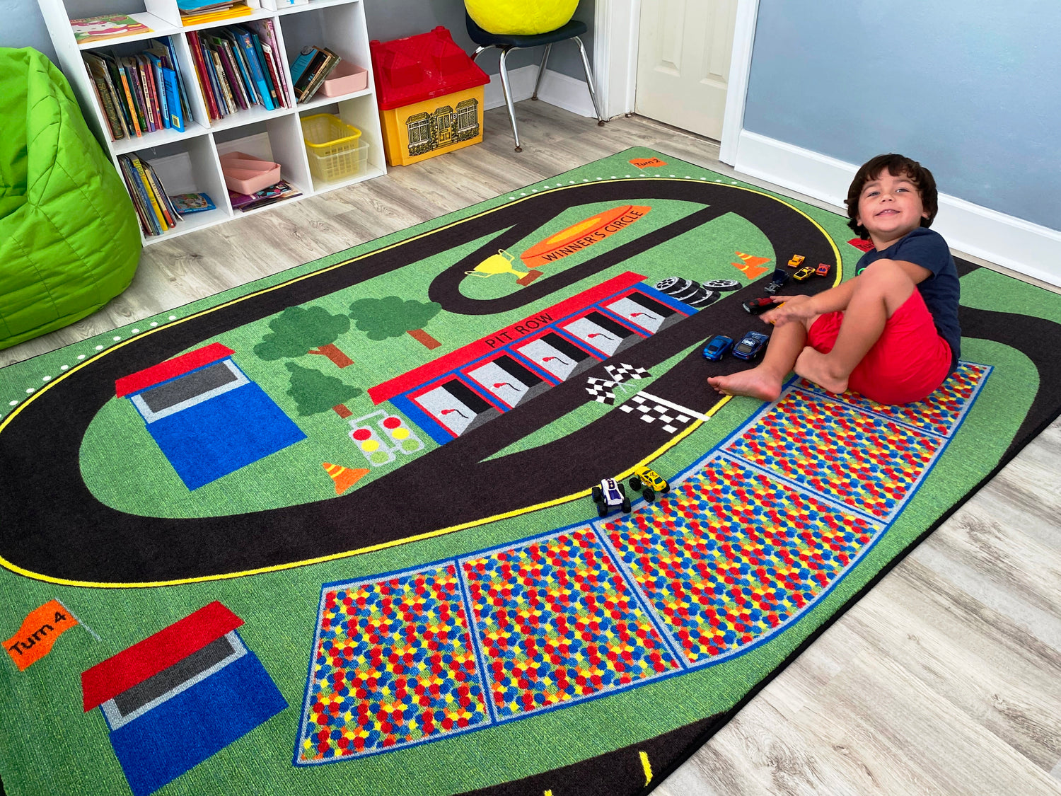- This racetrack rug is perfect for a kid's room or play area. With the details of the track, pit row, turns and grandstand, your kids can let their imagination run wild! The track is wide enough for most toy cars and is sure to provide hours of entertainment.