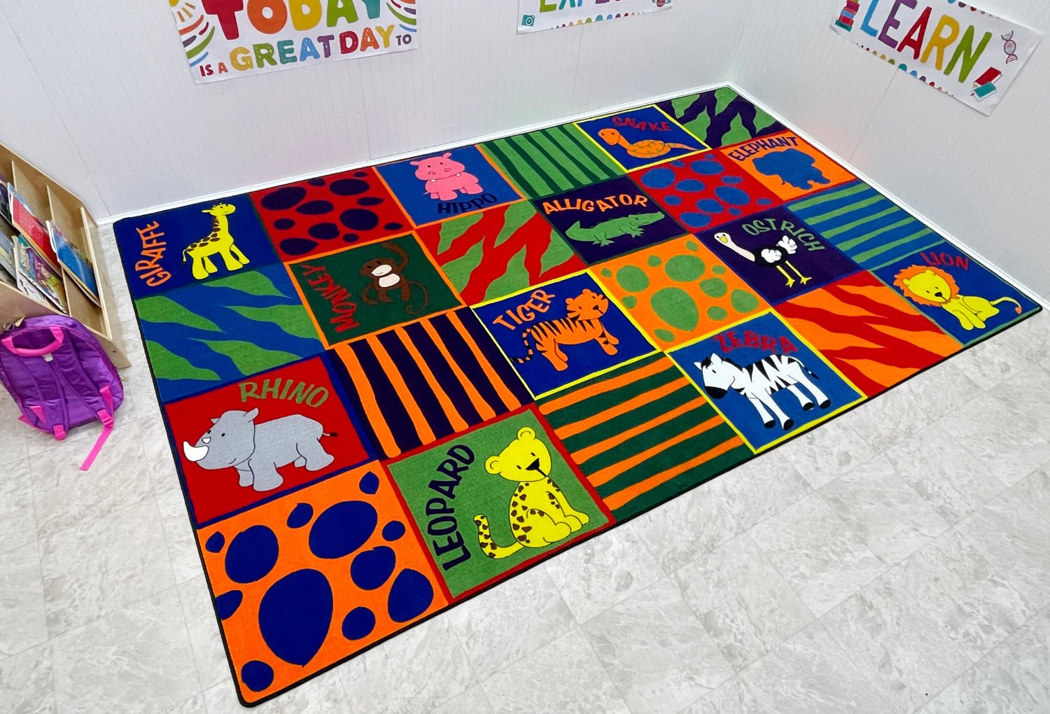 - This bright and fun patterned preschool rug is perfect for teaching animals or having a playful area for kids to sit in the classroom or playroom
