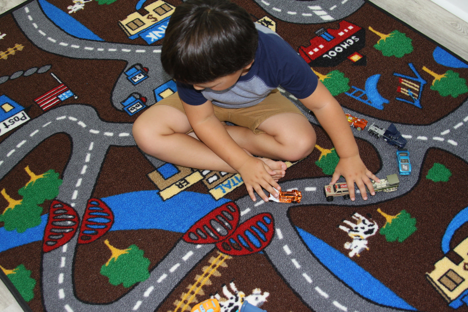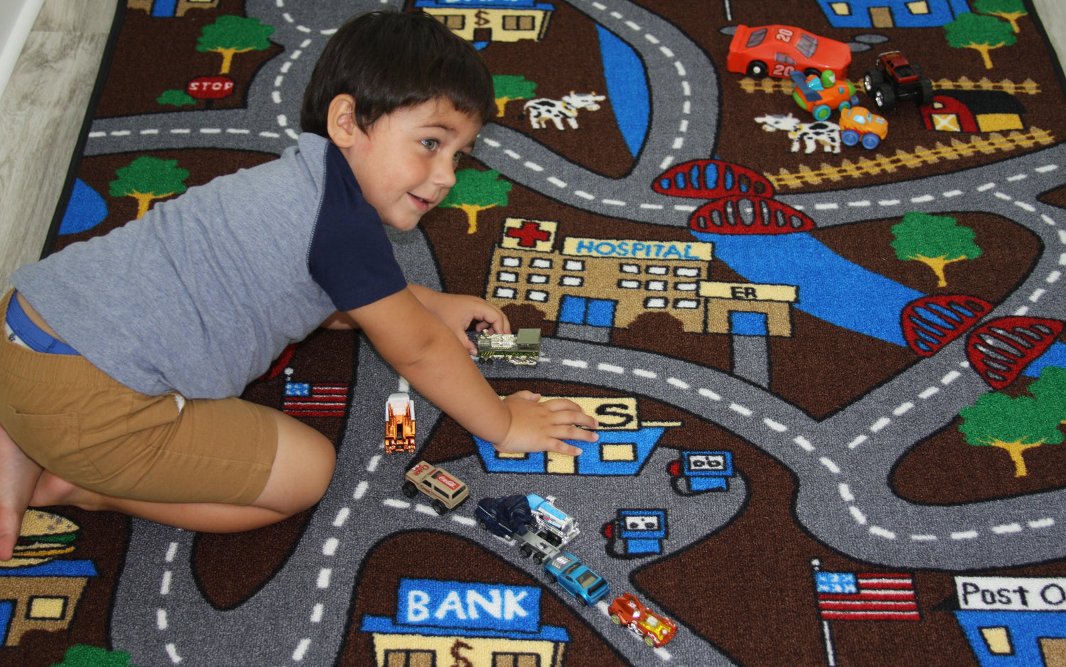 - Drive along these country roads and you will see trees, houses, railroads and even cows! All things country on this fun road rug!