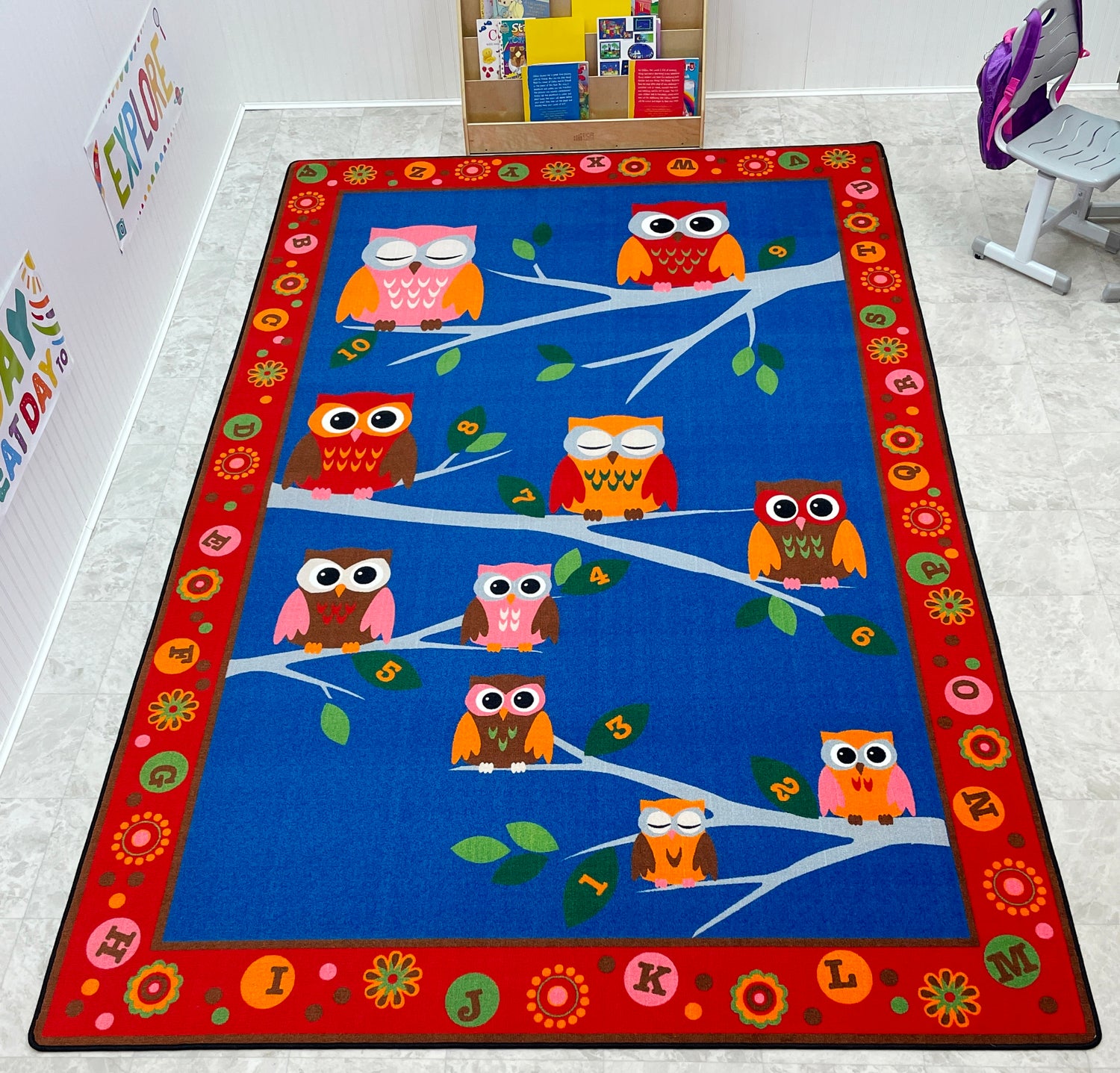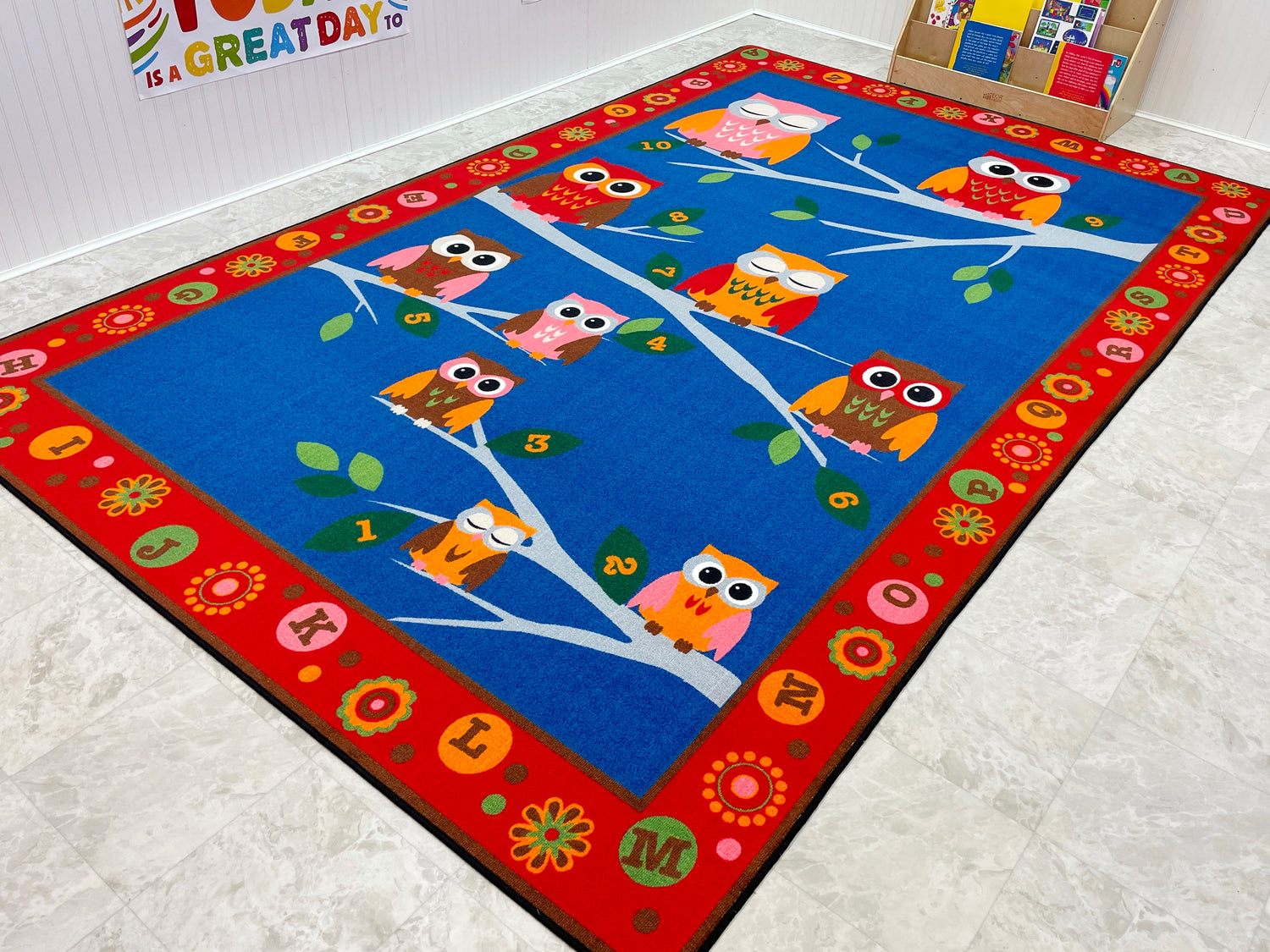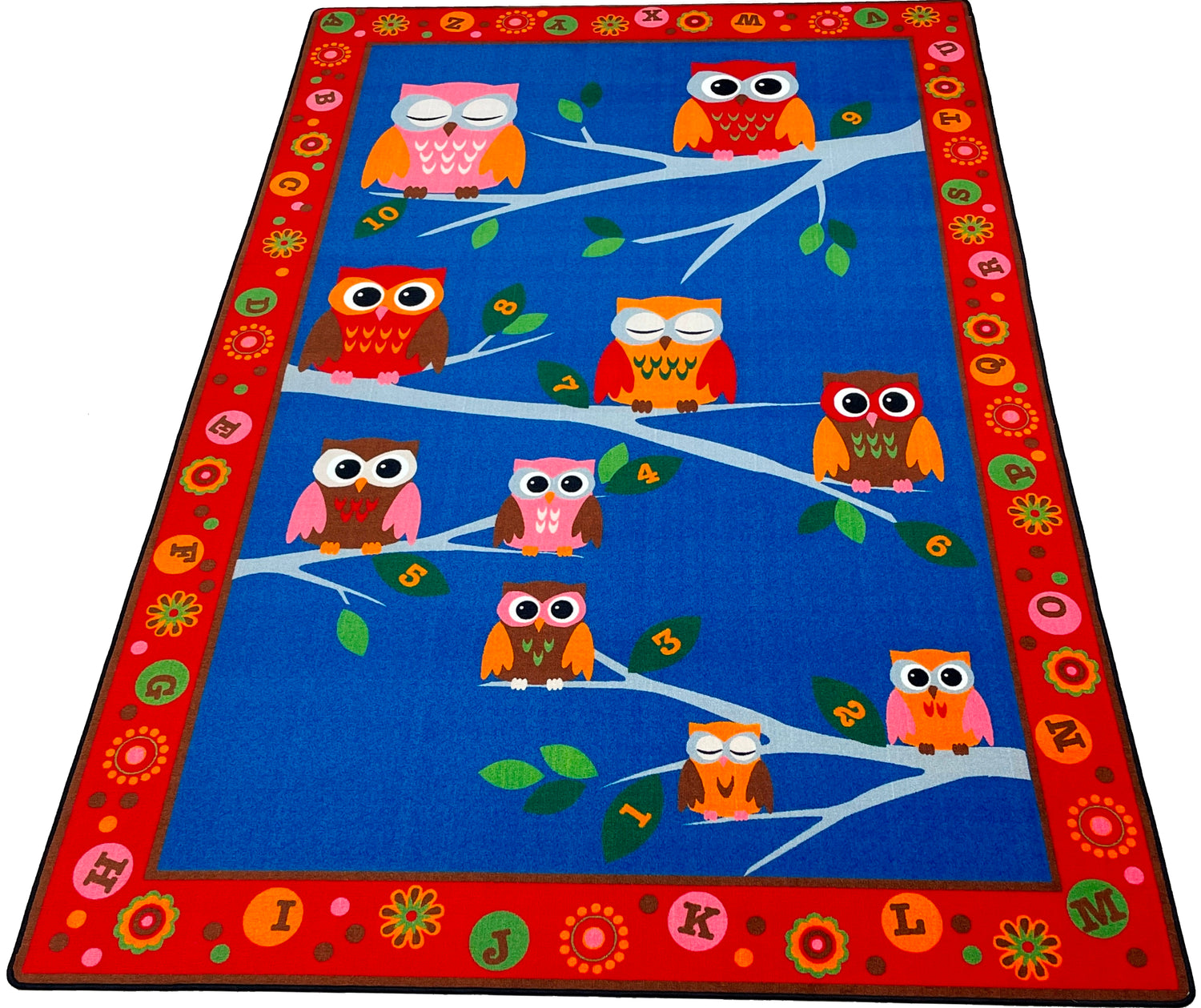 - Ten wise owls on this classroom rug make teaching letters and numbers a "Hoot!"