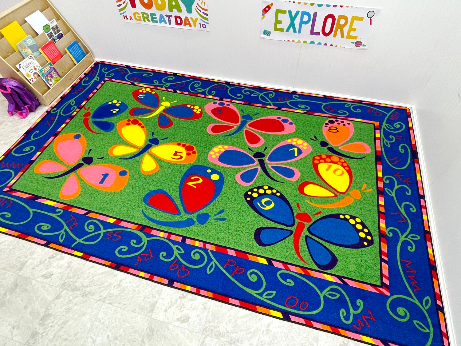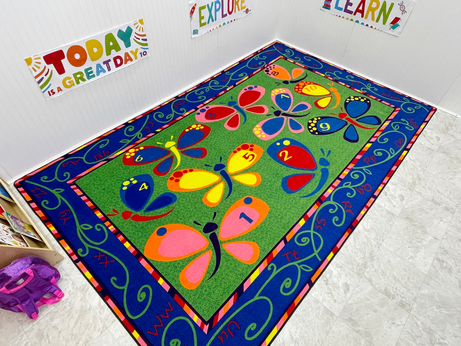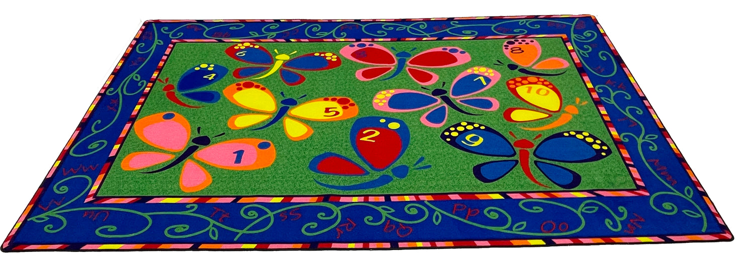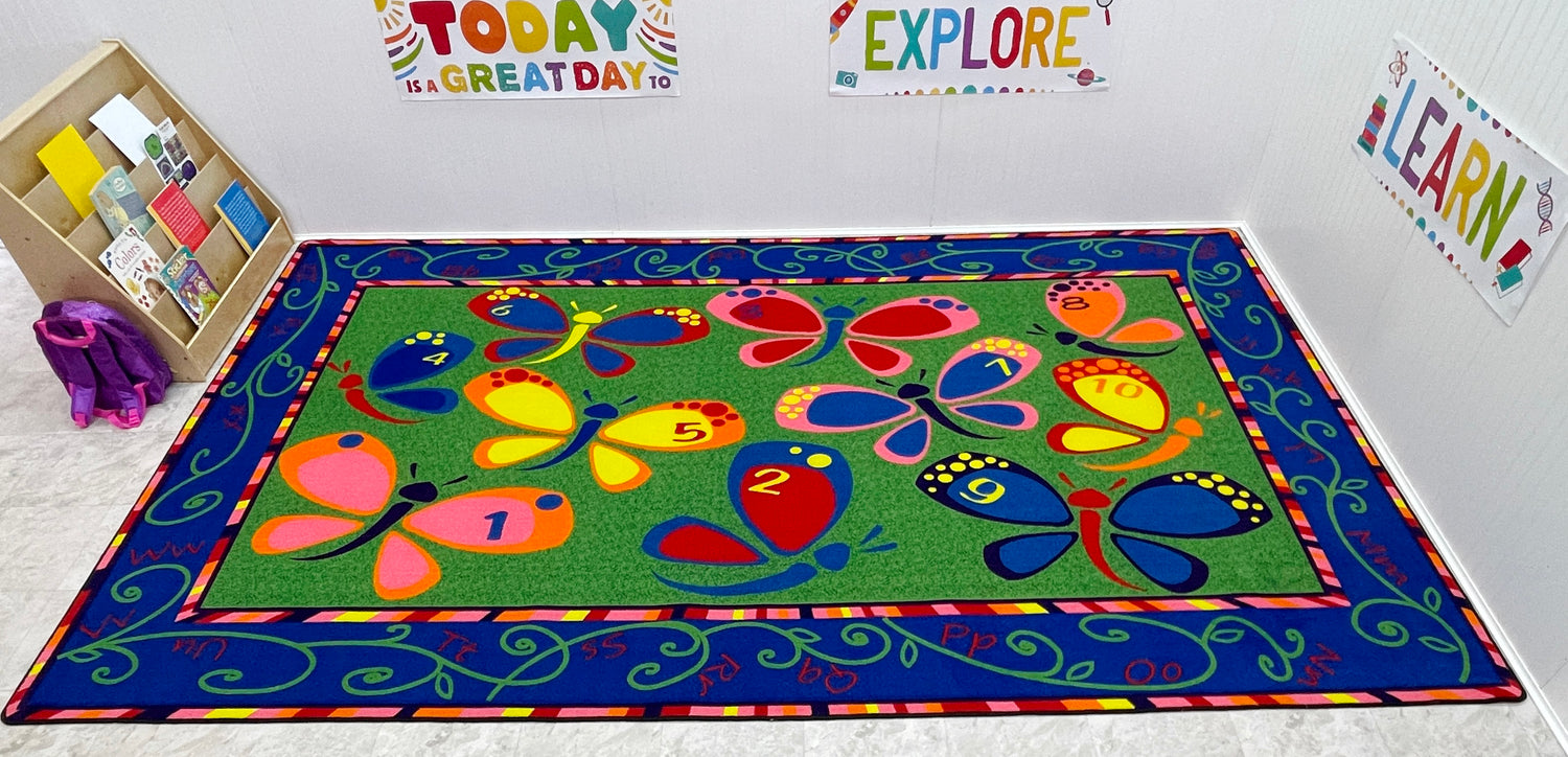 - These beautiful butterflies can brighten up any kid's space. With the alphabet in the border and dots on the butterflies to teach numbers, Learning on the Fly classroom rug is a fun classroom accessory.