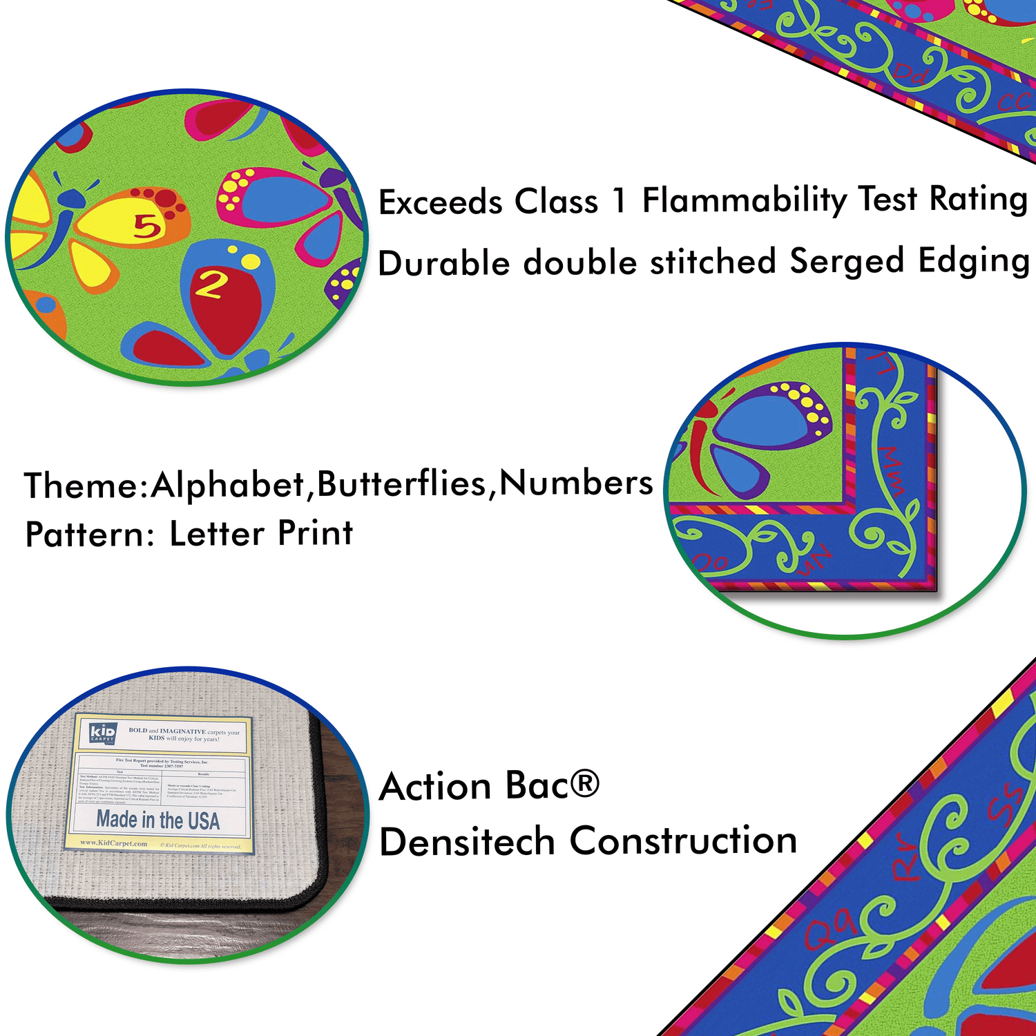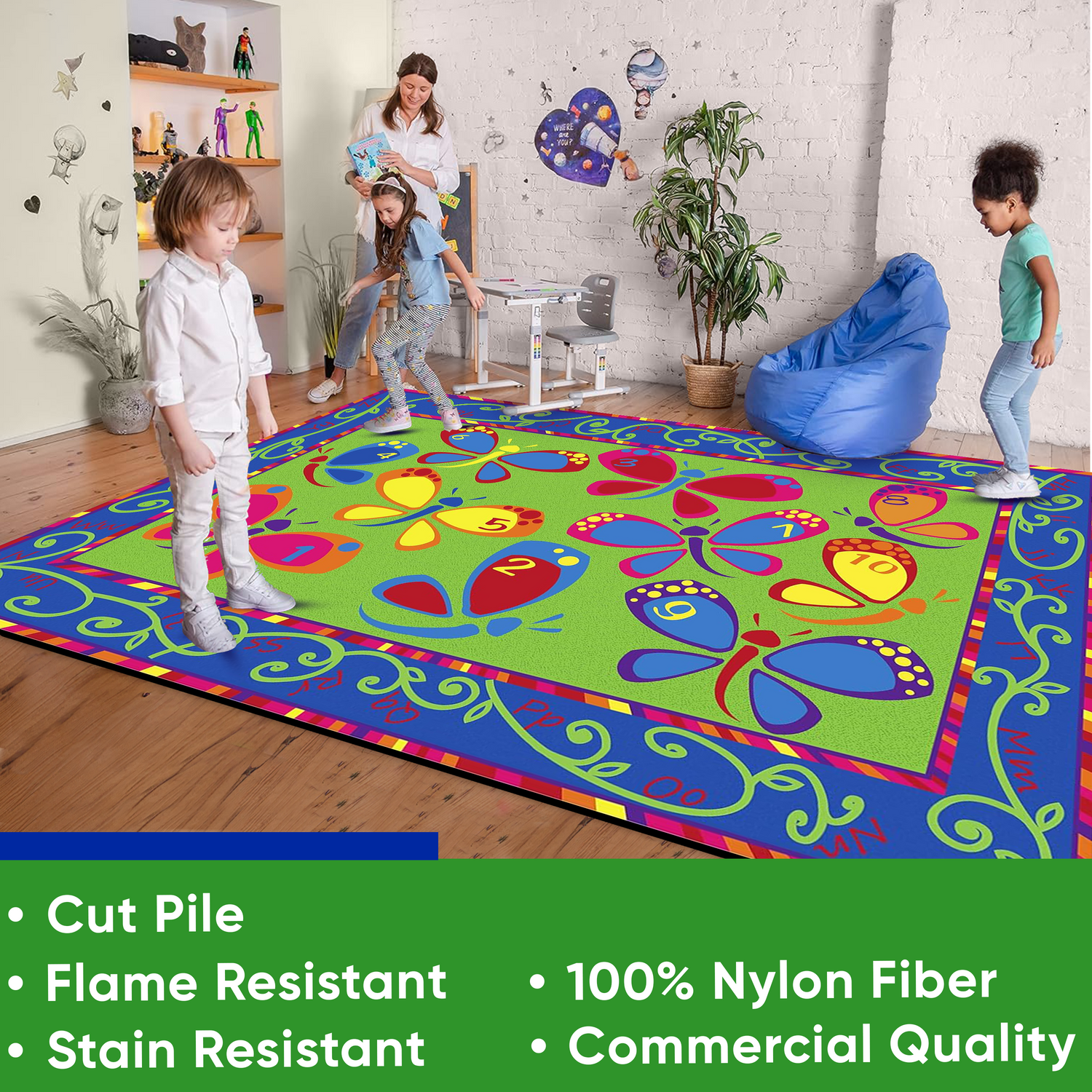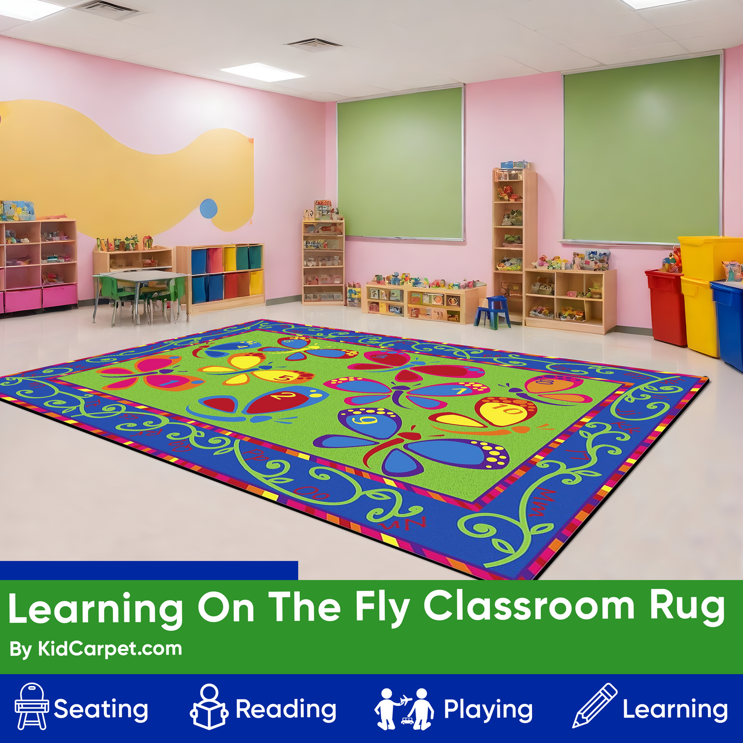 - These beautiful butterflies can brighten up any kid's space. With the alphabet in the border and dots on the butterflies to teach numbers, Learning on the Fly classroom rug is a fun classroom accessory.