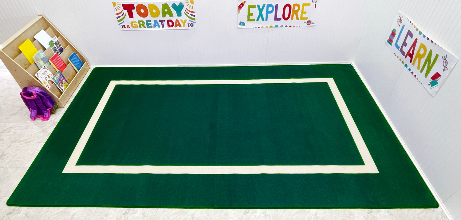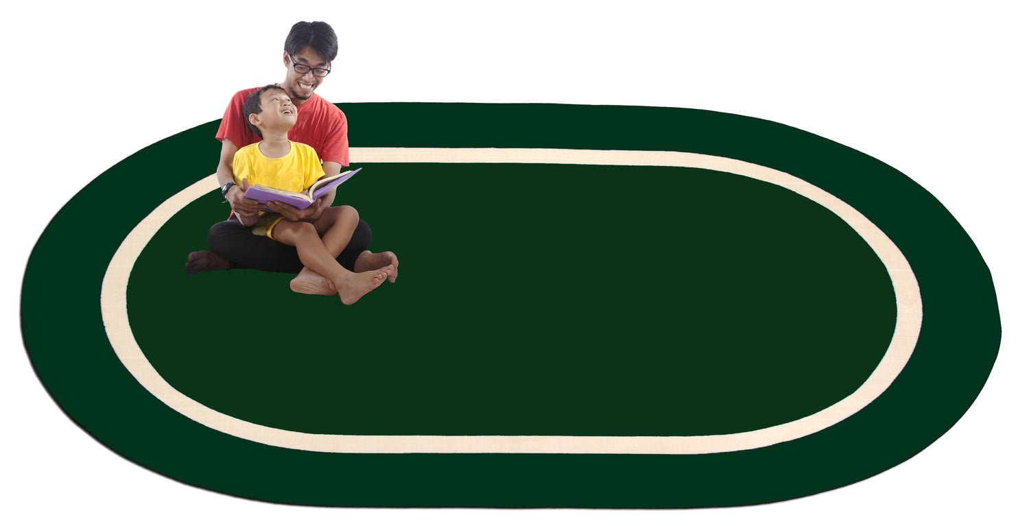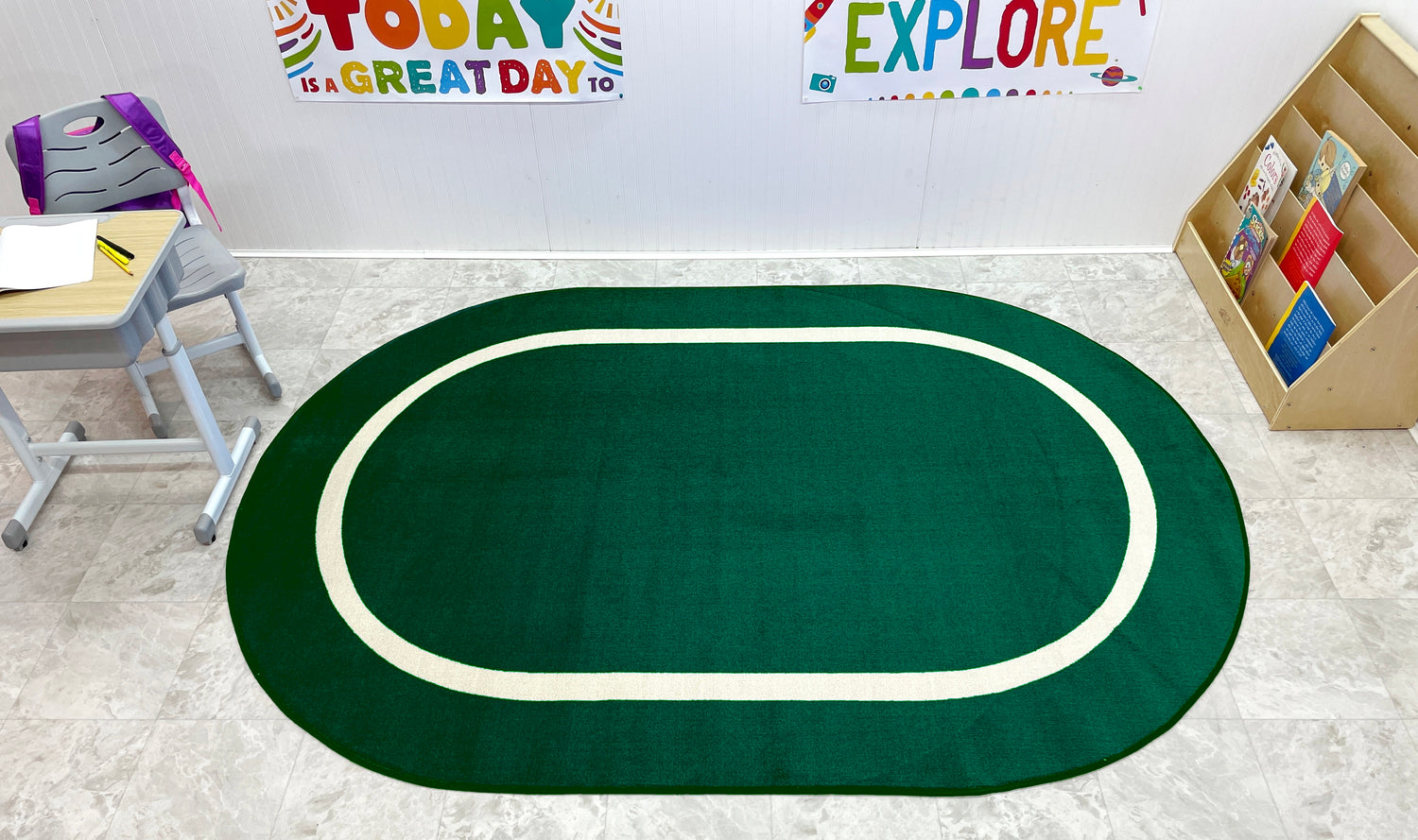 Montessori Classroom Rug Green With Creme Line - Montessori Classroom Rug Green/Creme / 4' X 6' Oval Quick Ship is backordered and will ship as soon as it is back in stock.
