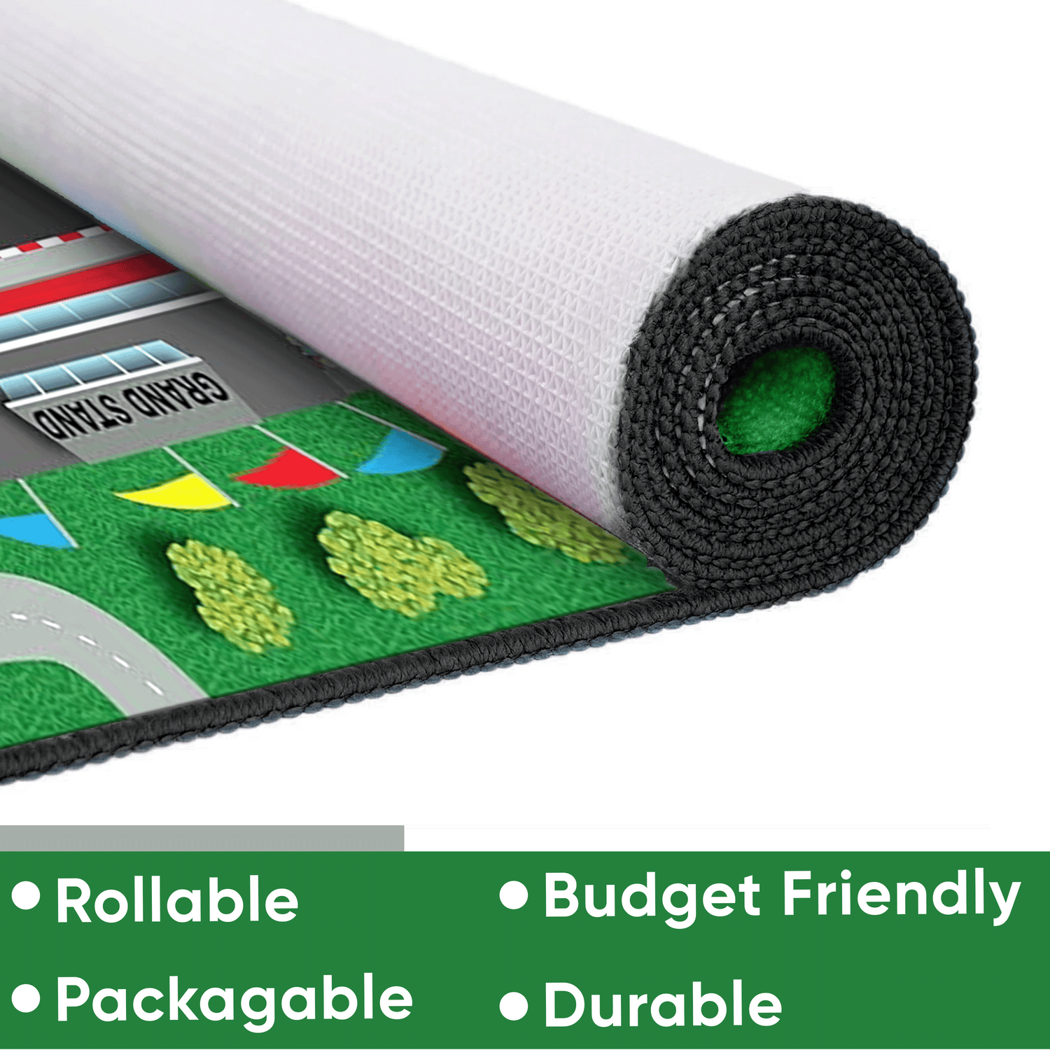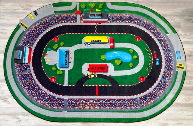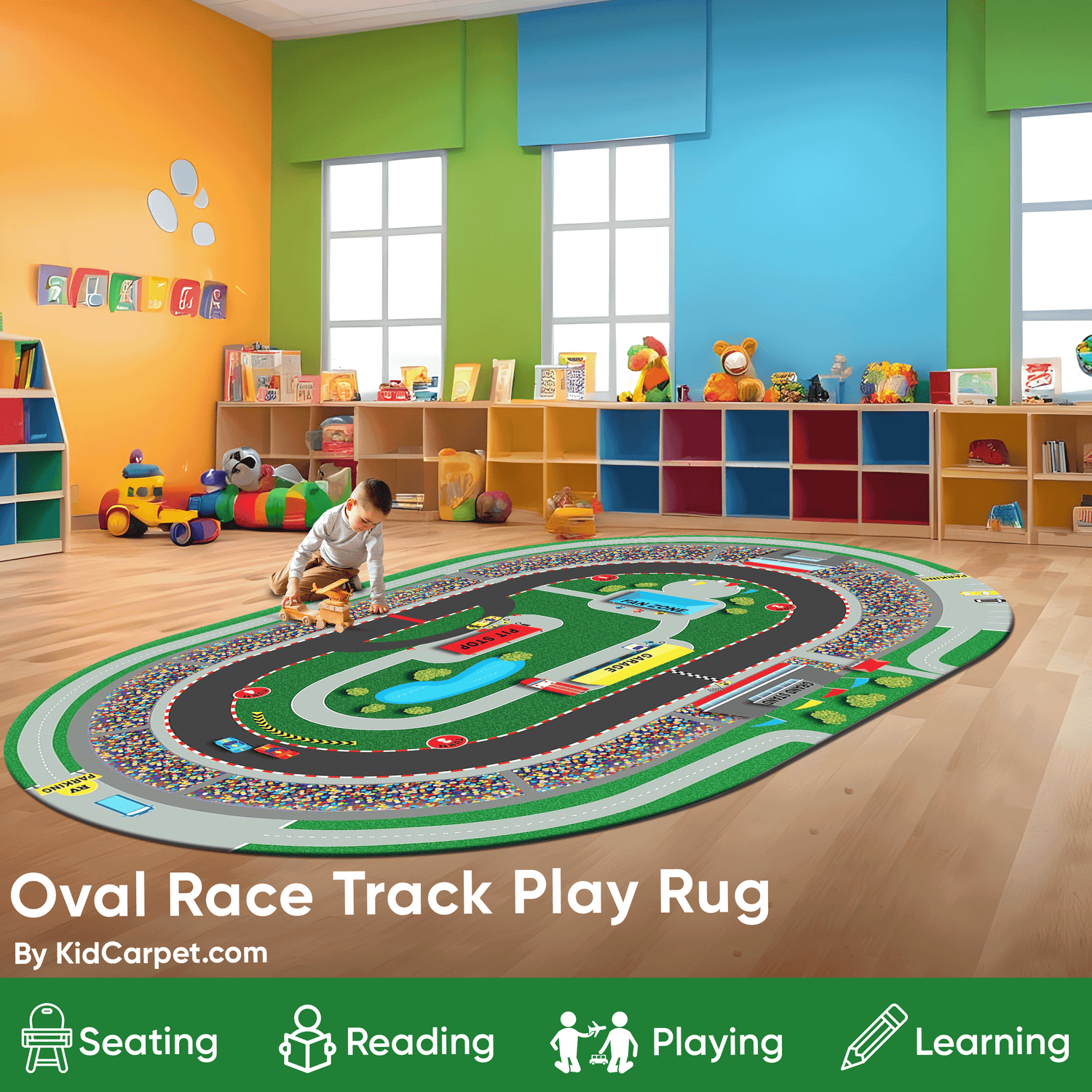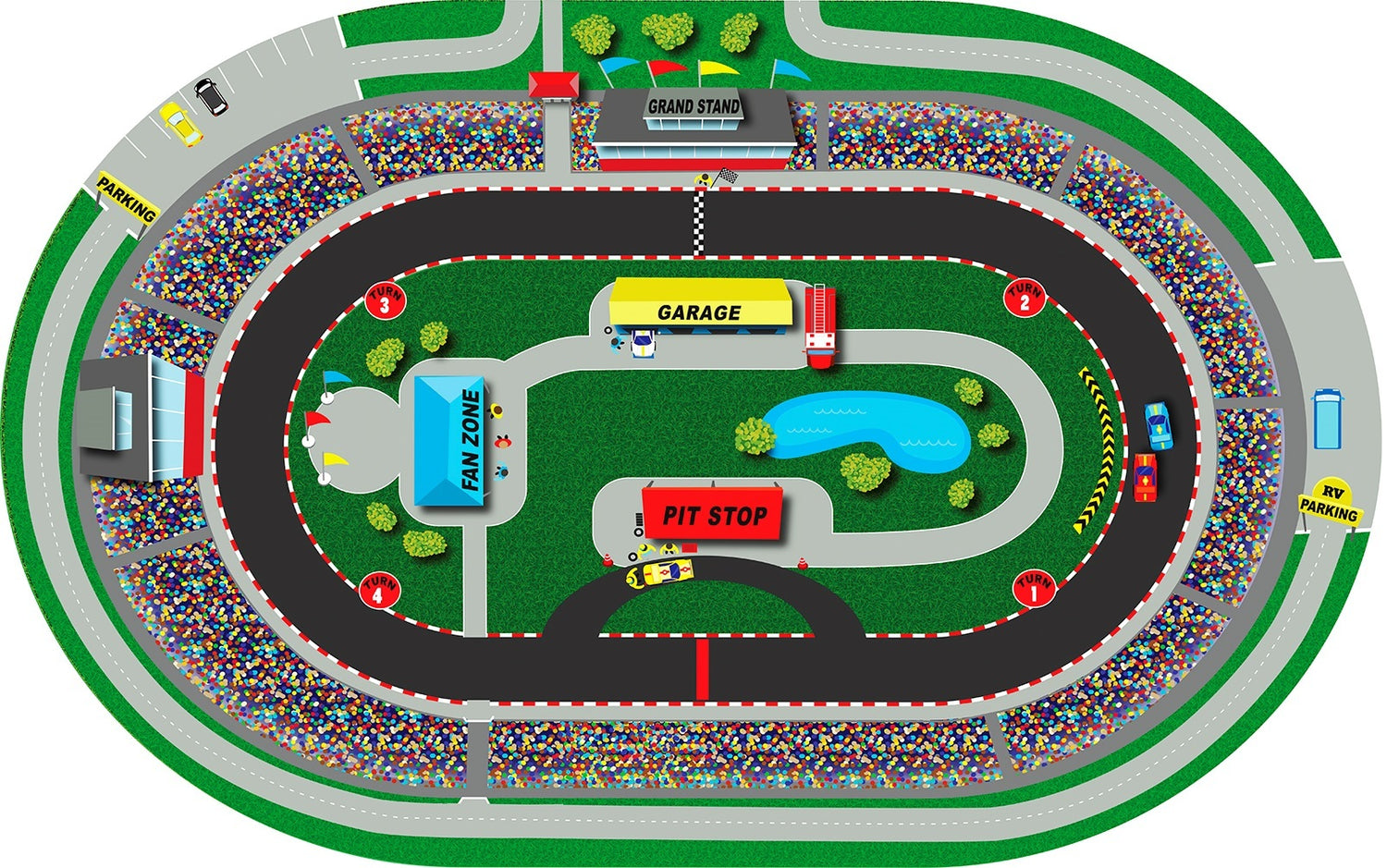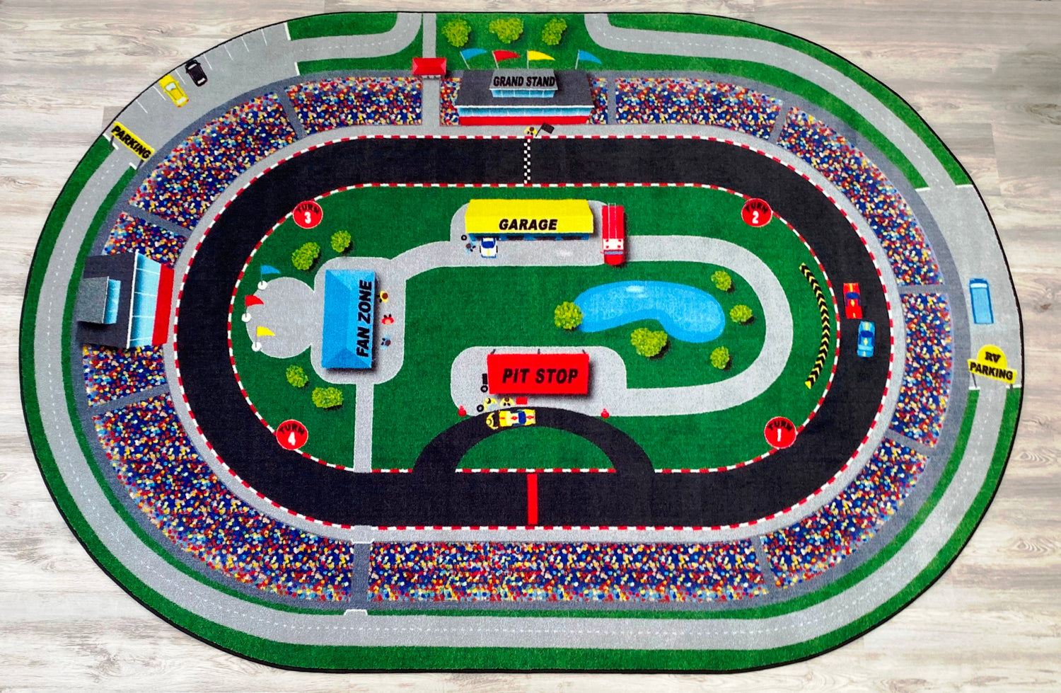 - Buckle up and take on the speedway! This fun racetrack theme area rug is perfect for play time.