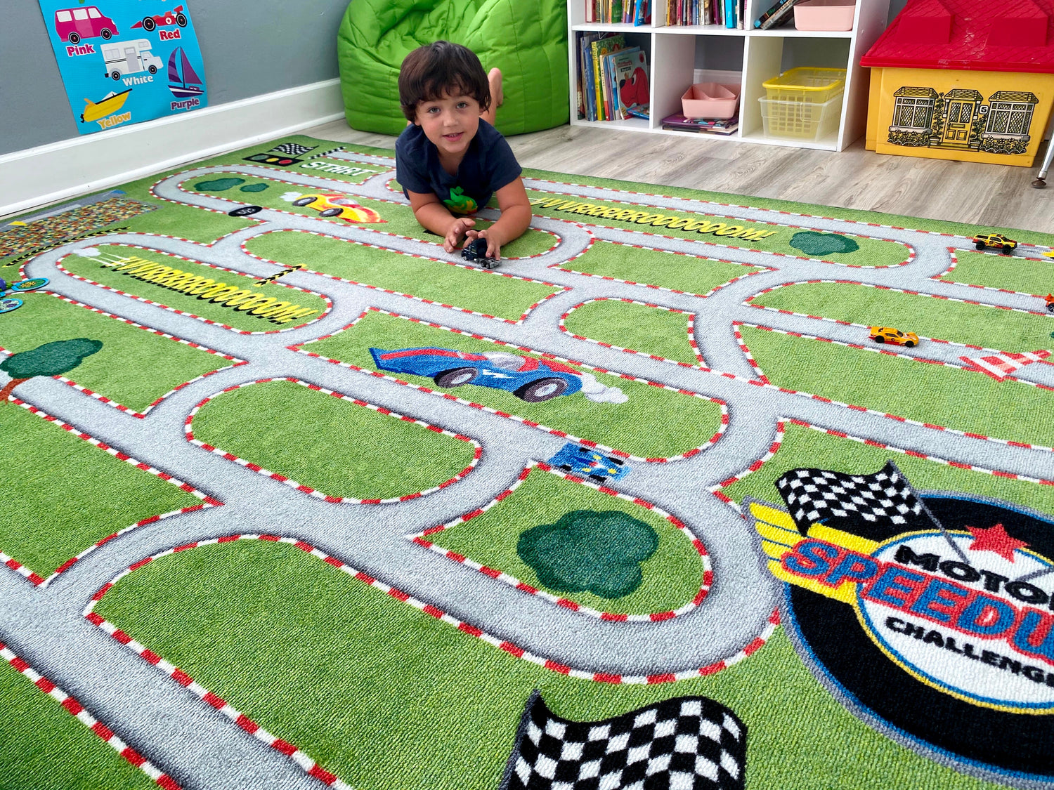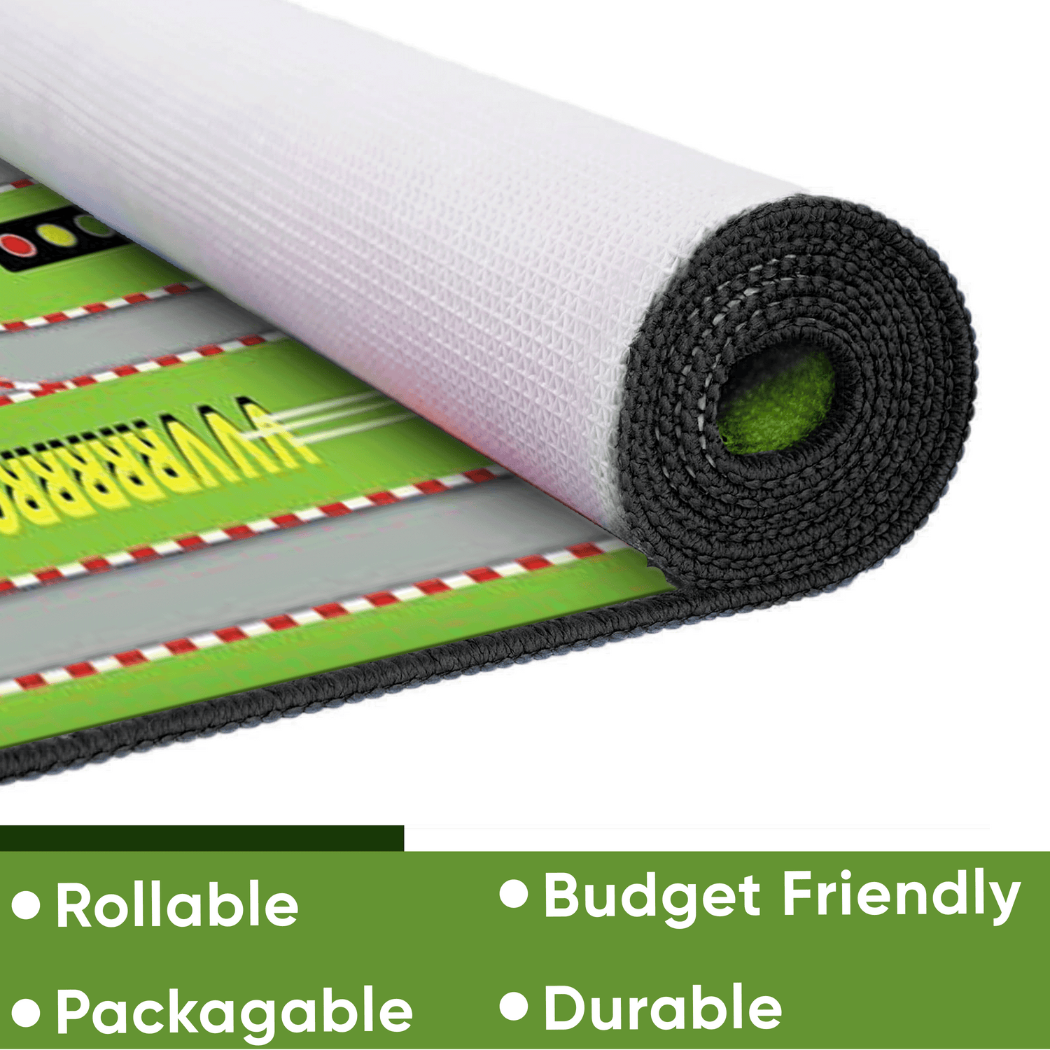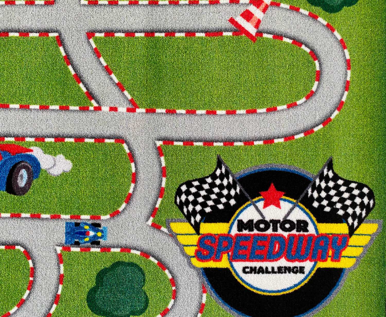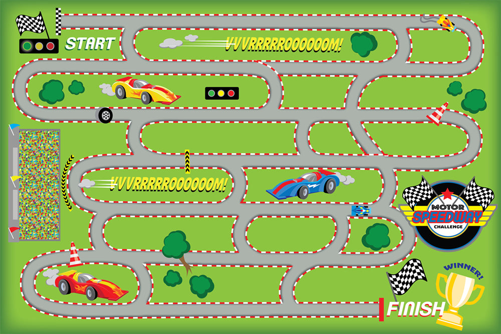 - This racetrack rug features a unique maze like track. The track is wide enough for most toy cars and is sure to provide hours of entertainment.