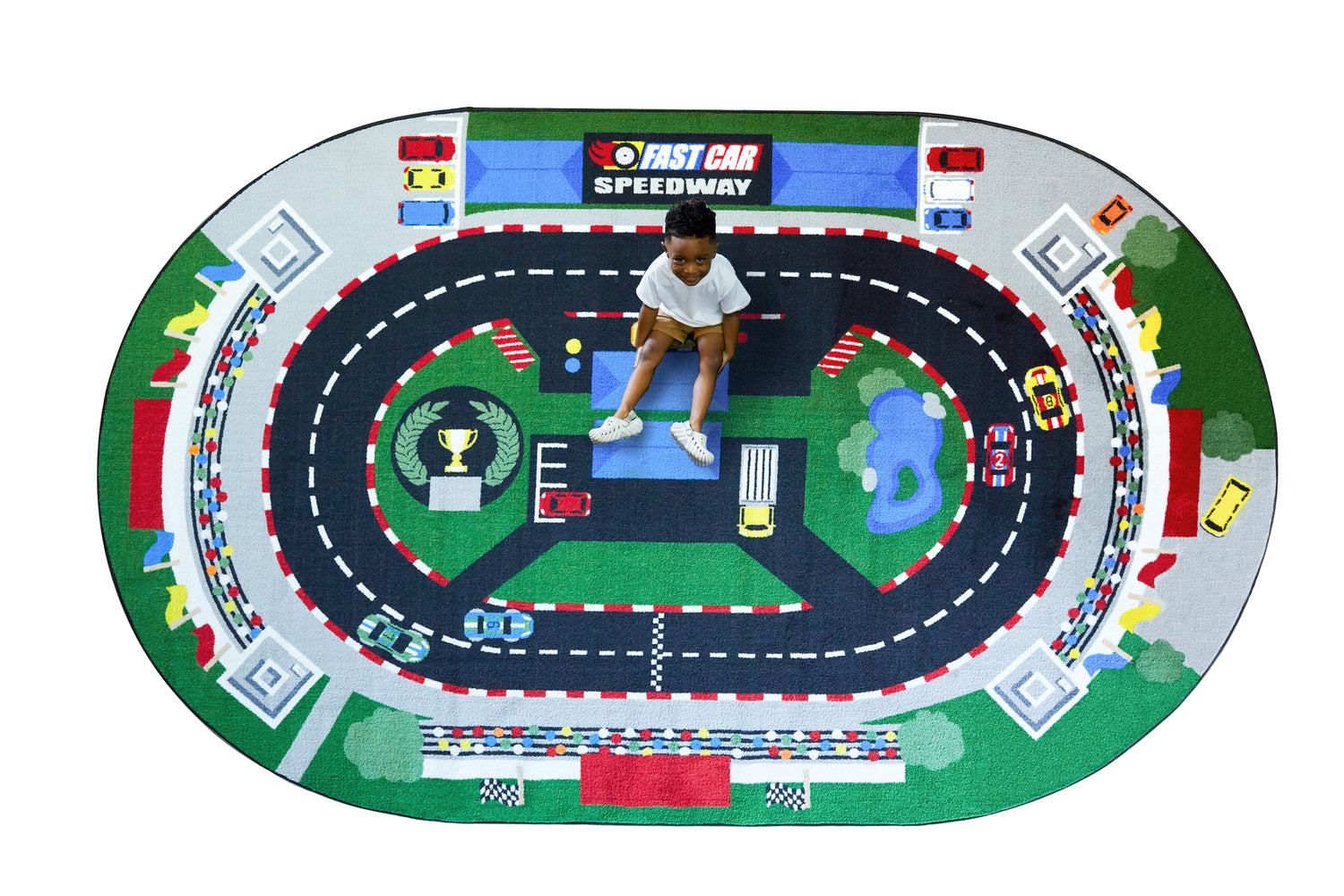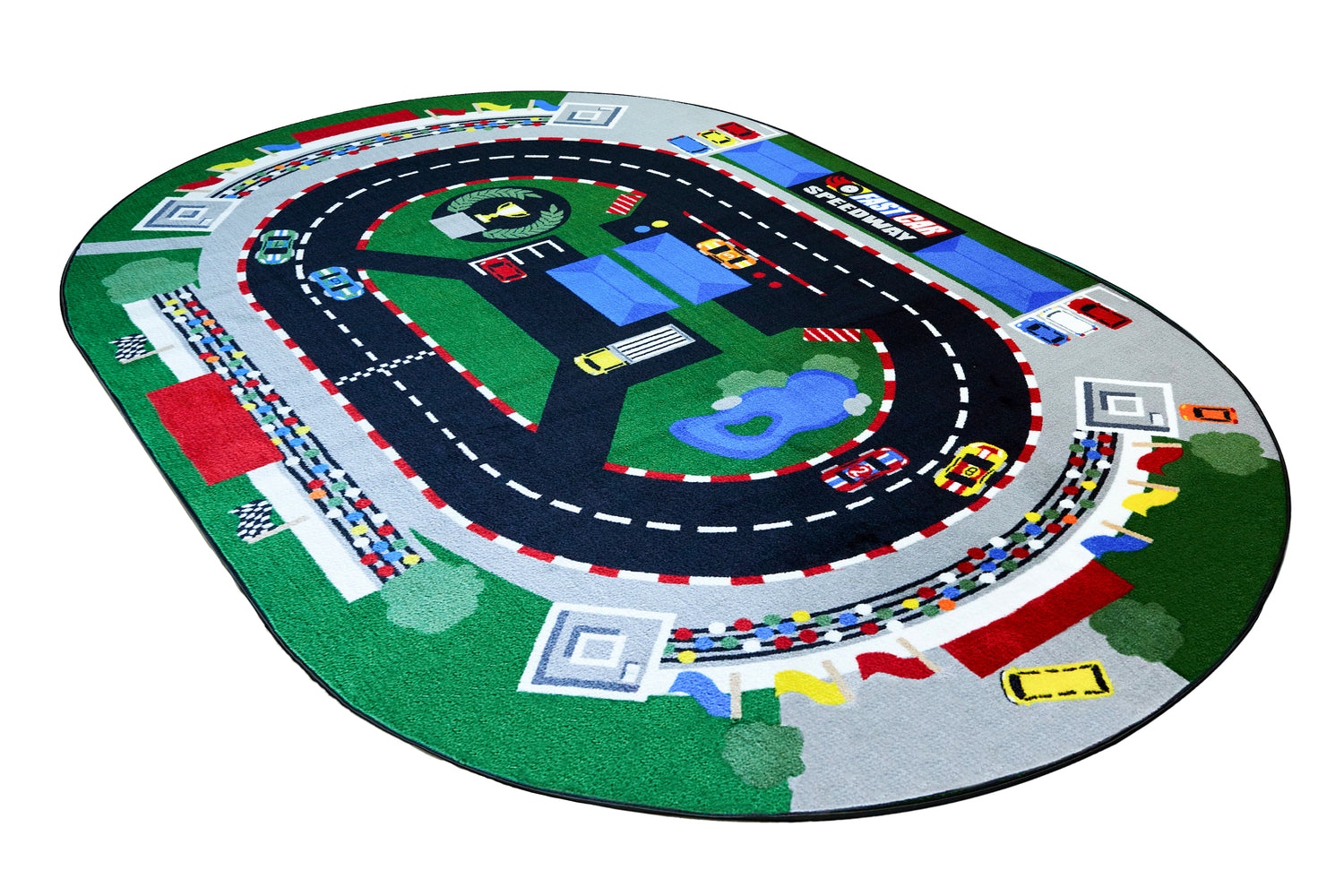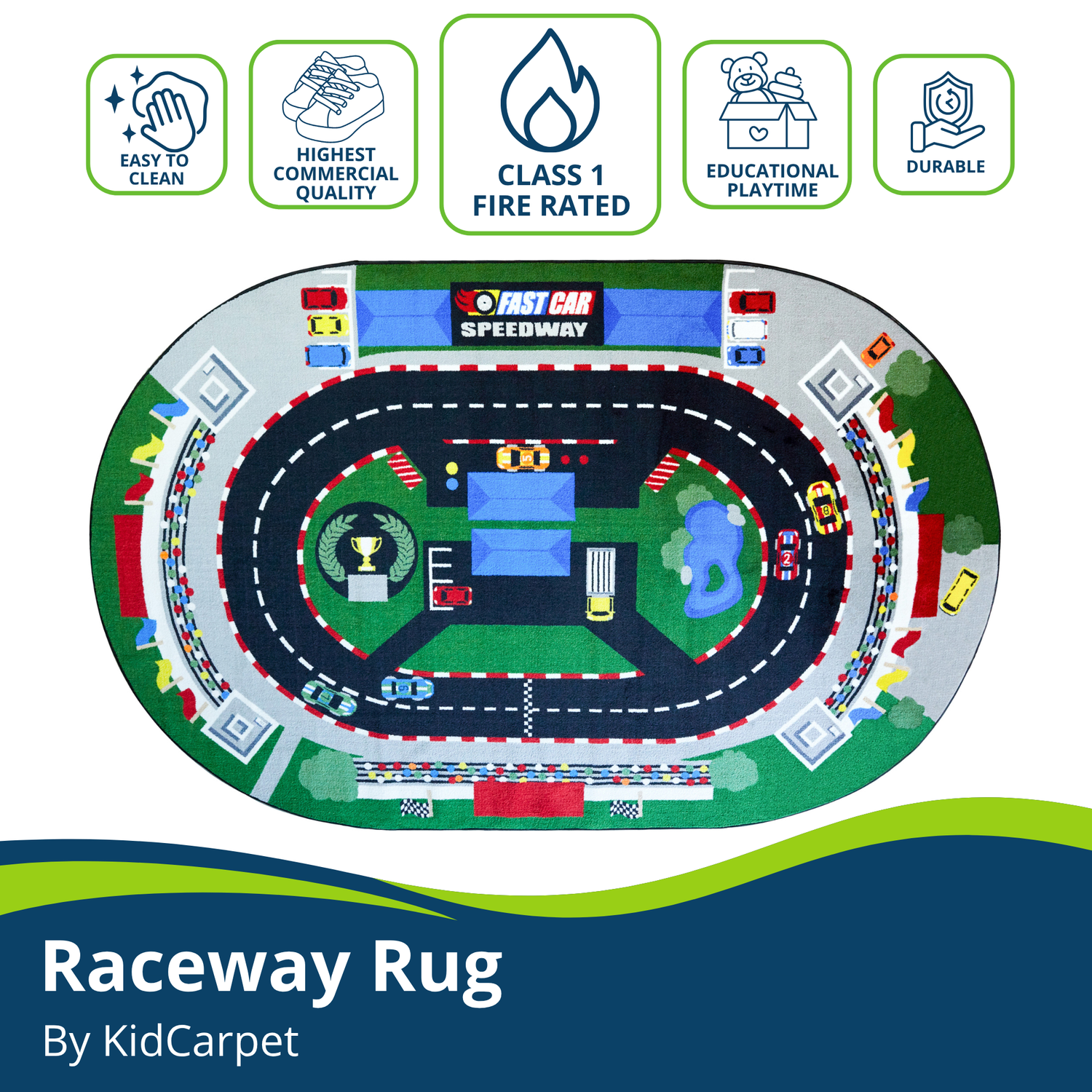 - If you have a race car fan in the house, the Raceway Rug is sure to be a hit! The track size is perfect for play cars and even remote control cars, so start your engines and drop the checkered flag for some high speed fun!