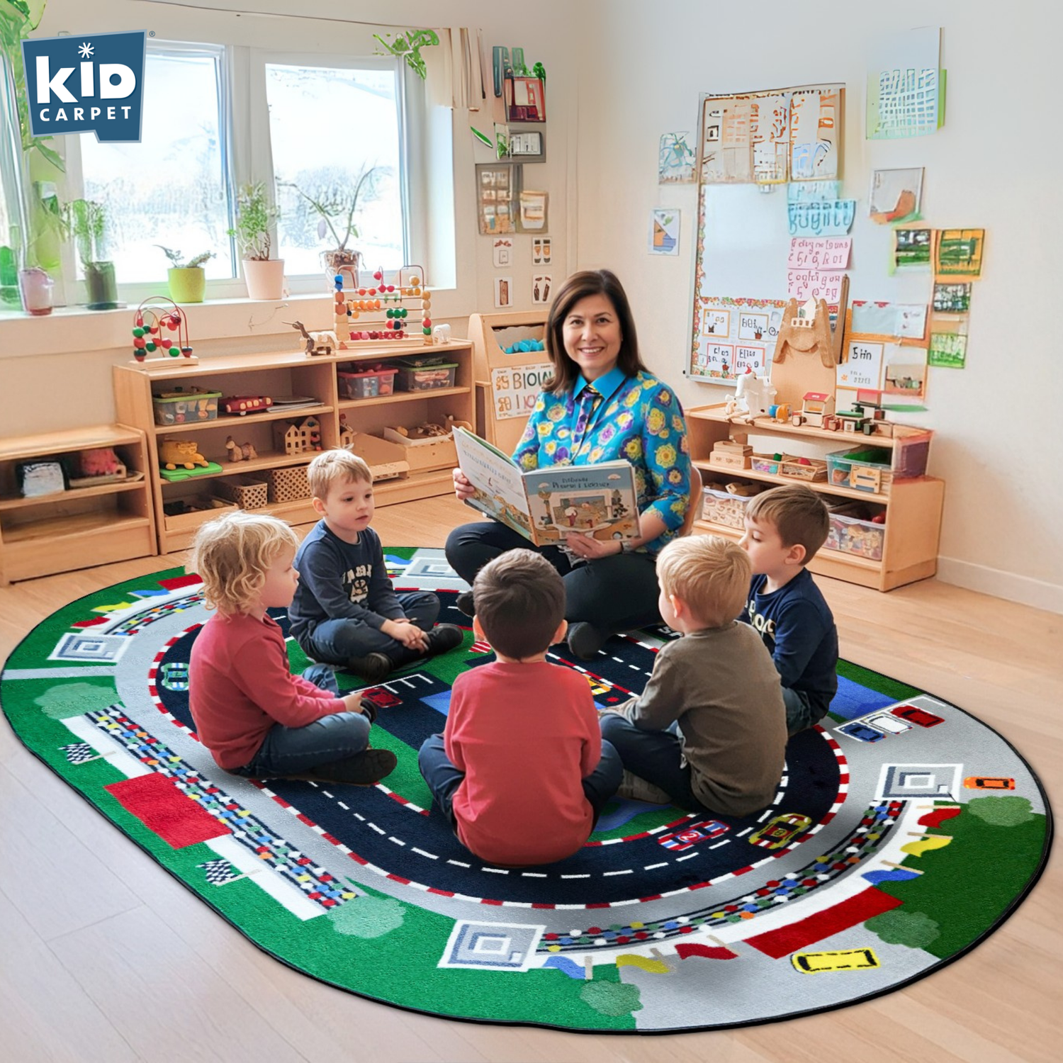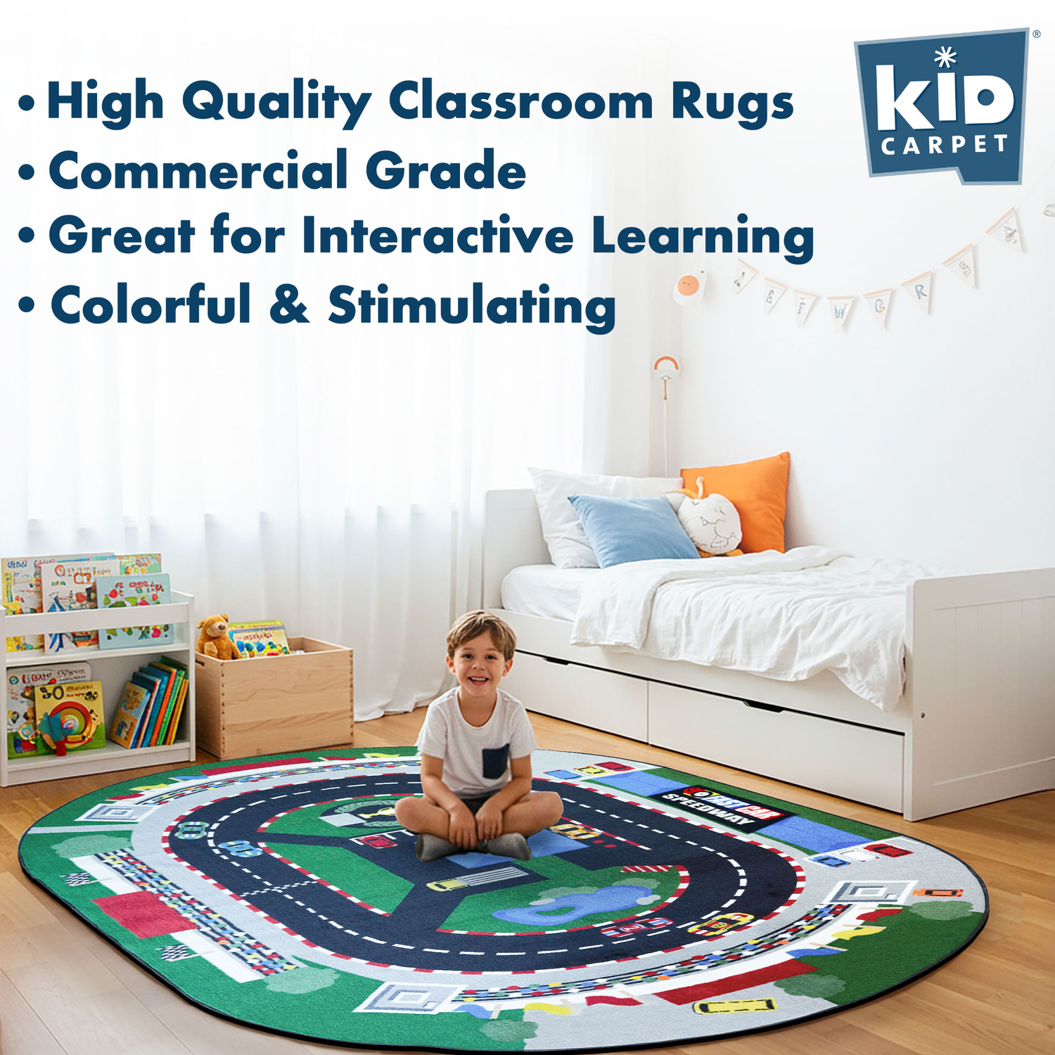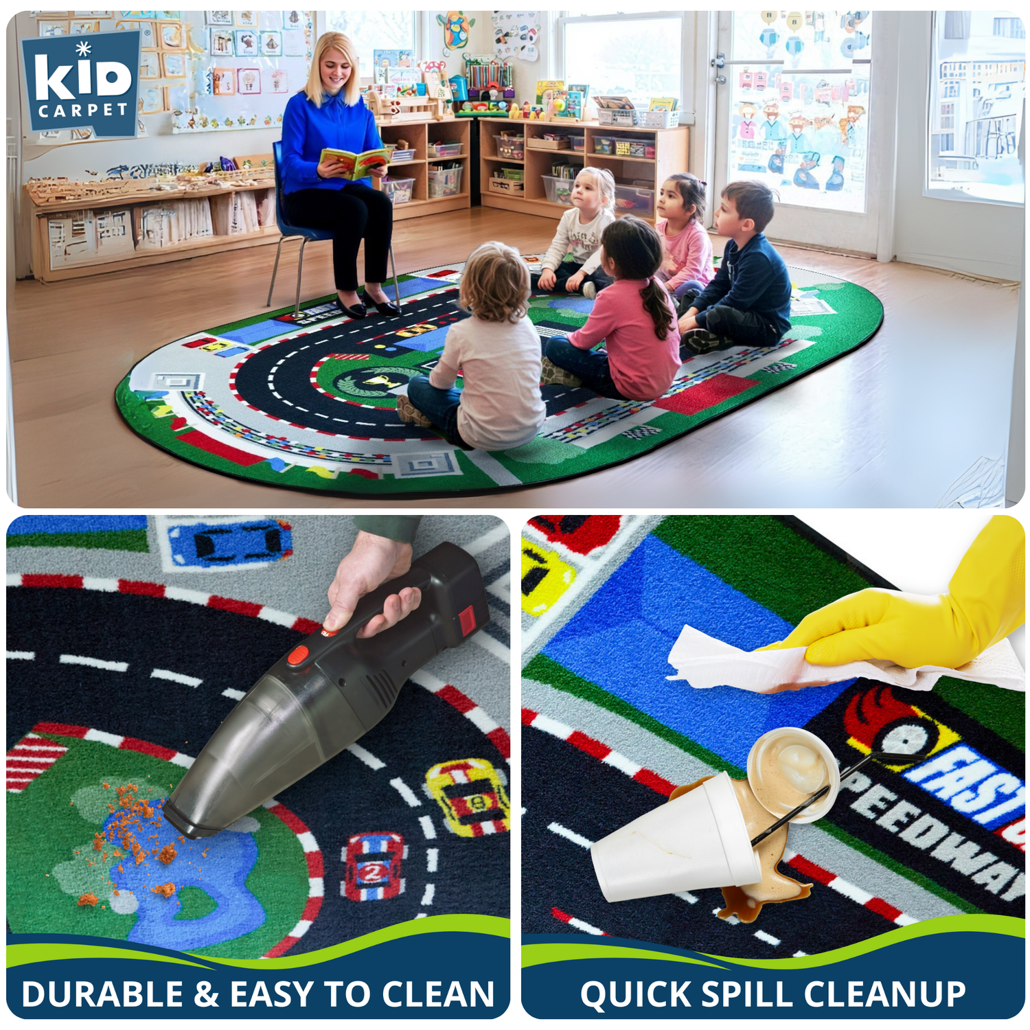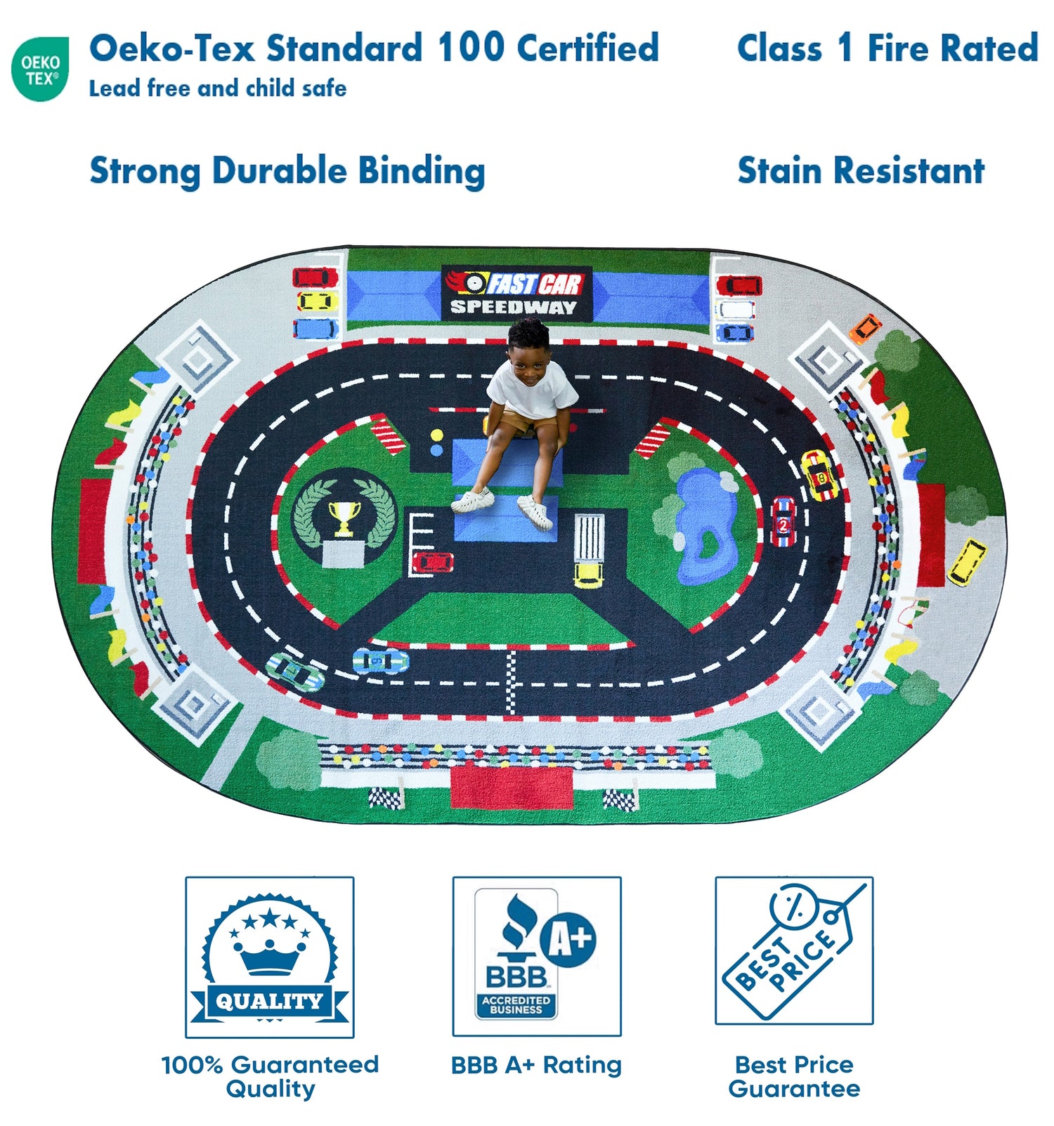 - If you have a race car fan in the house, the Raceway Rug is sure to be a hit! The track size is perfect for play cars and even remote control cars, so start your engines and drop the checkered flag for some high speed fun!