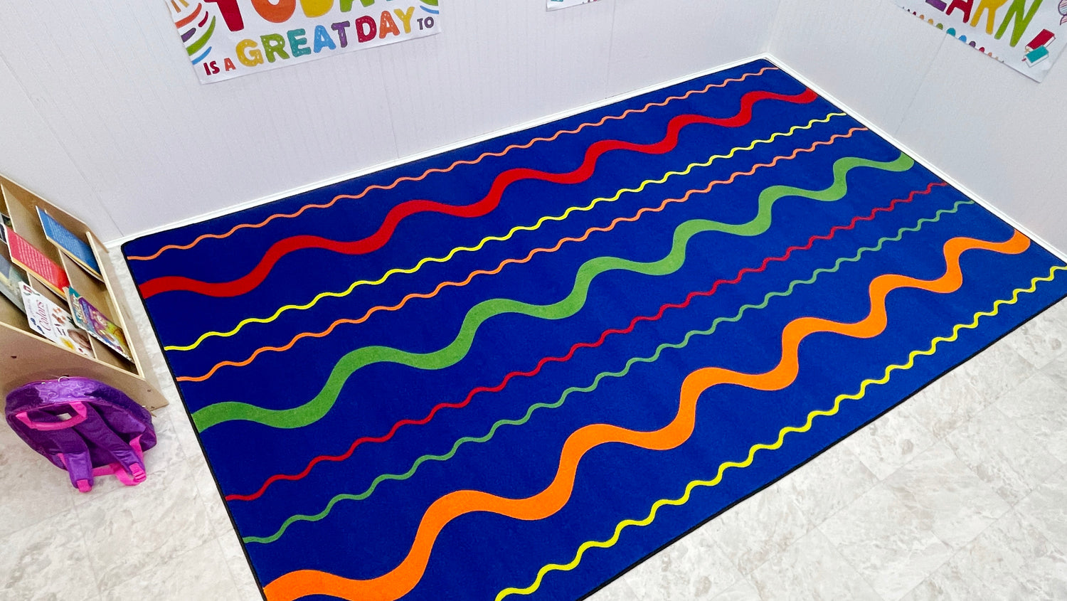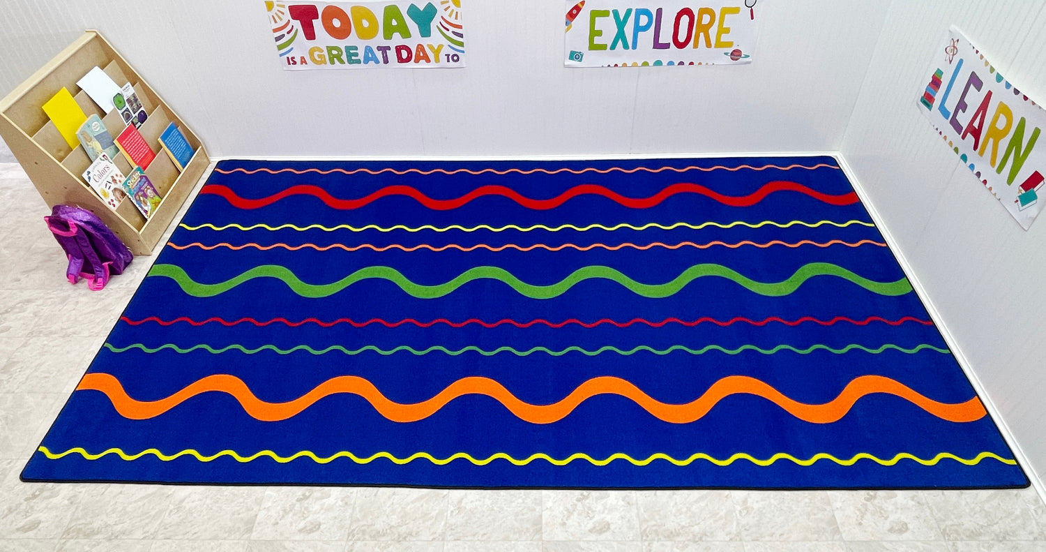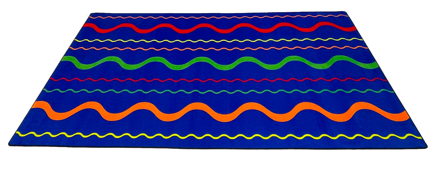 - The multicolored wavy lines on a blue background make this fun kid's rug a simple yet playful design