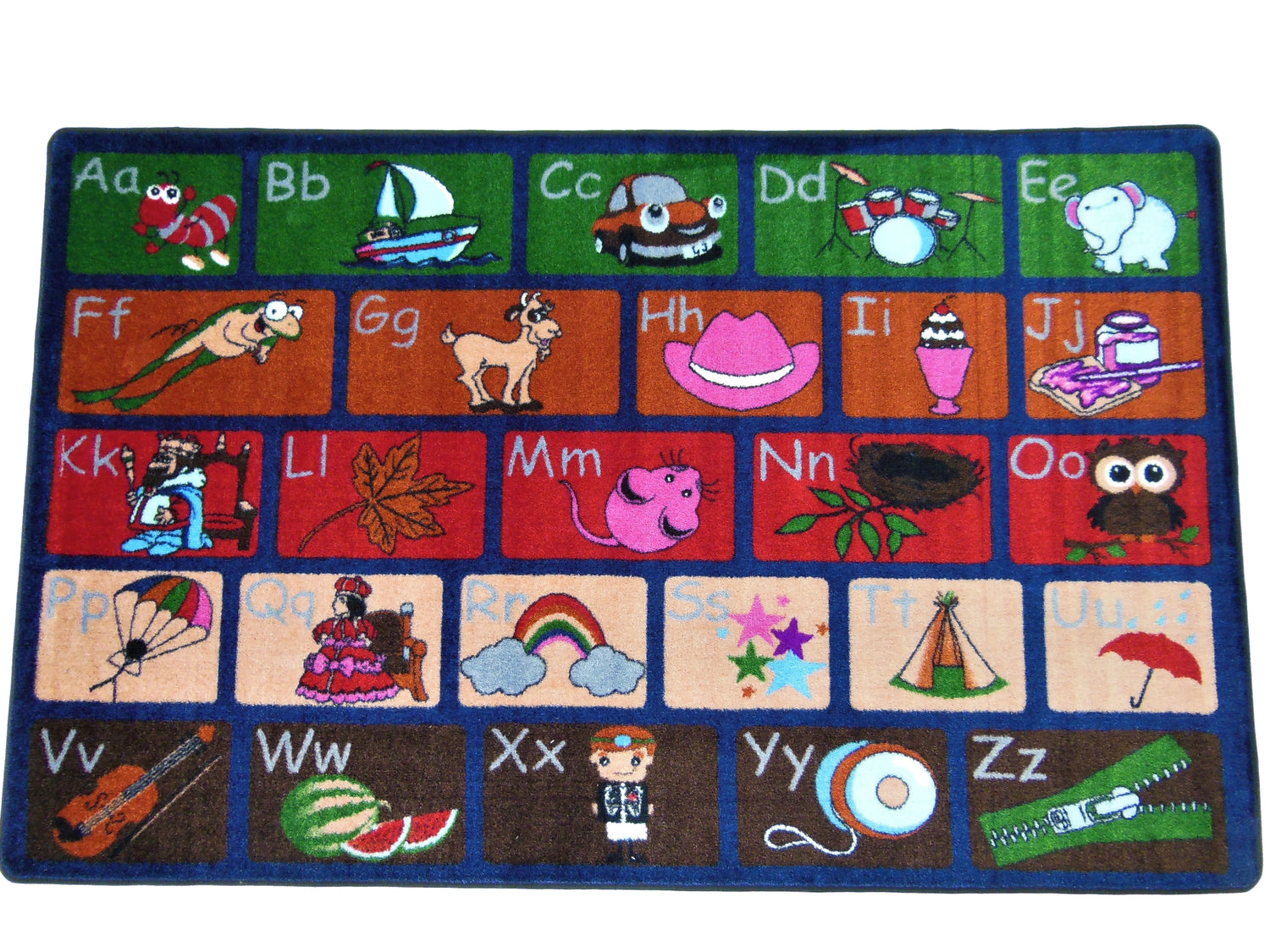 - This classroom rug features the alphabet in a bright and cheerful letter and word picture association scheme.