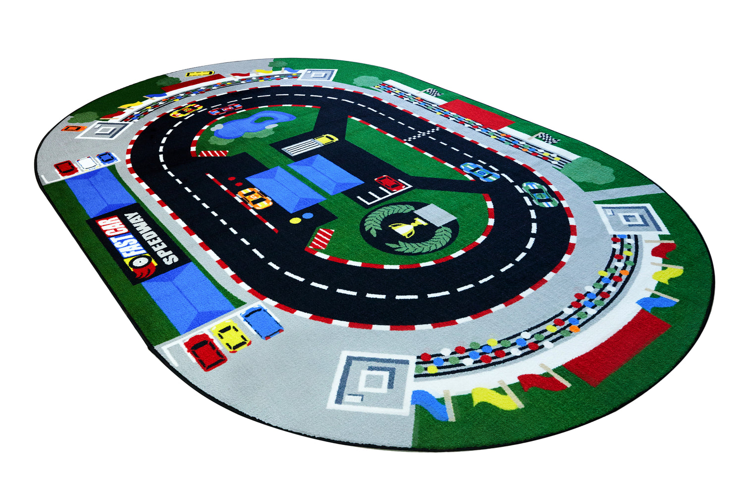 • If you have a race car fan in the house, the Raceway Rug is sure to be a hit! The track size is perfect for play cars and even remote control cars, so start your engines and drop the checkered flag for some high speed fun!