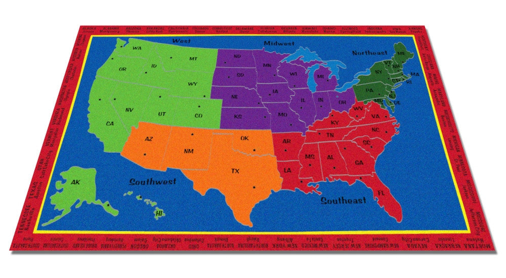 - This United States of America Map Rug features the states grouped in their respective regions and the state abbreviations. The border lists each state in alphabetical order with the state capital.